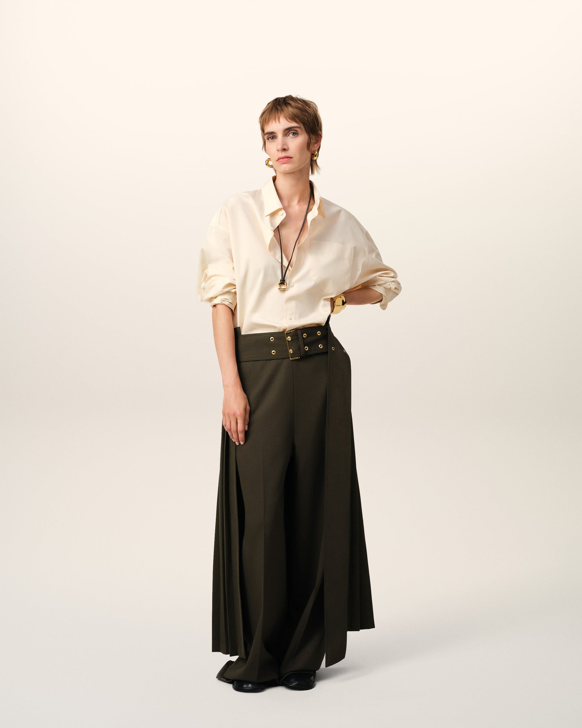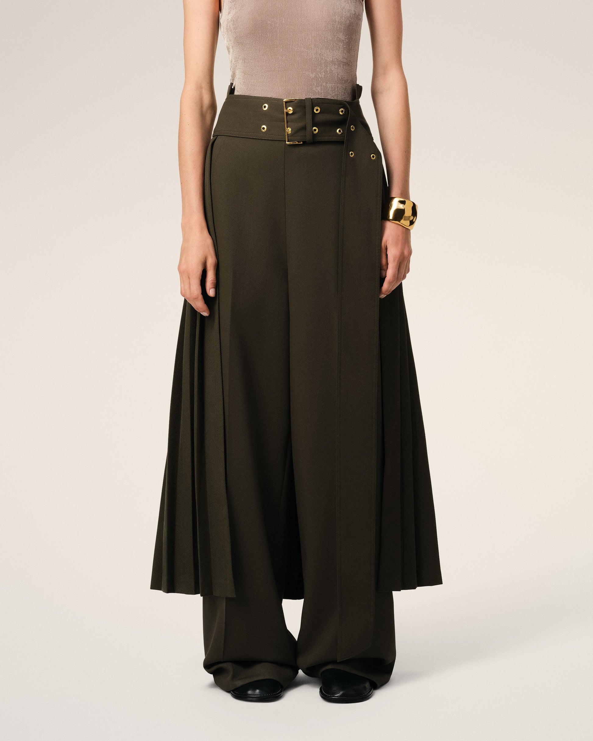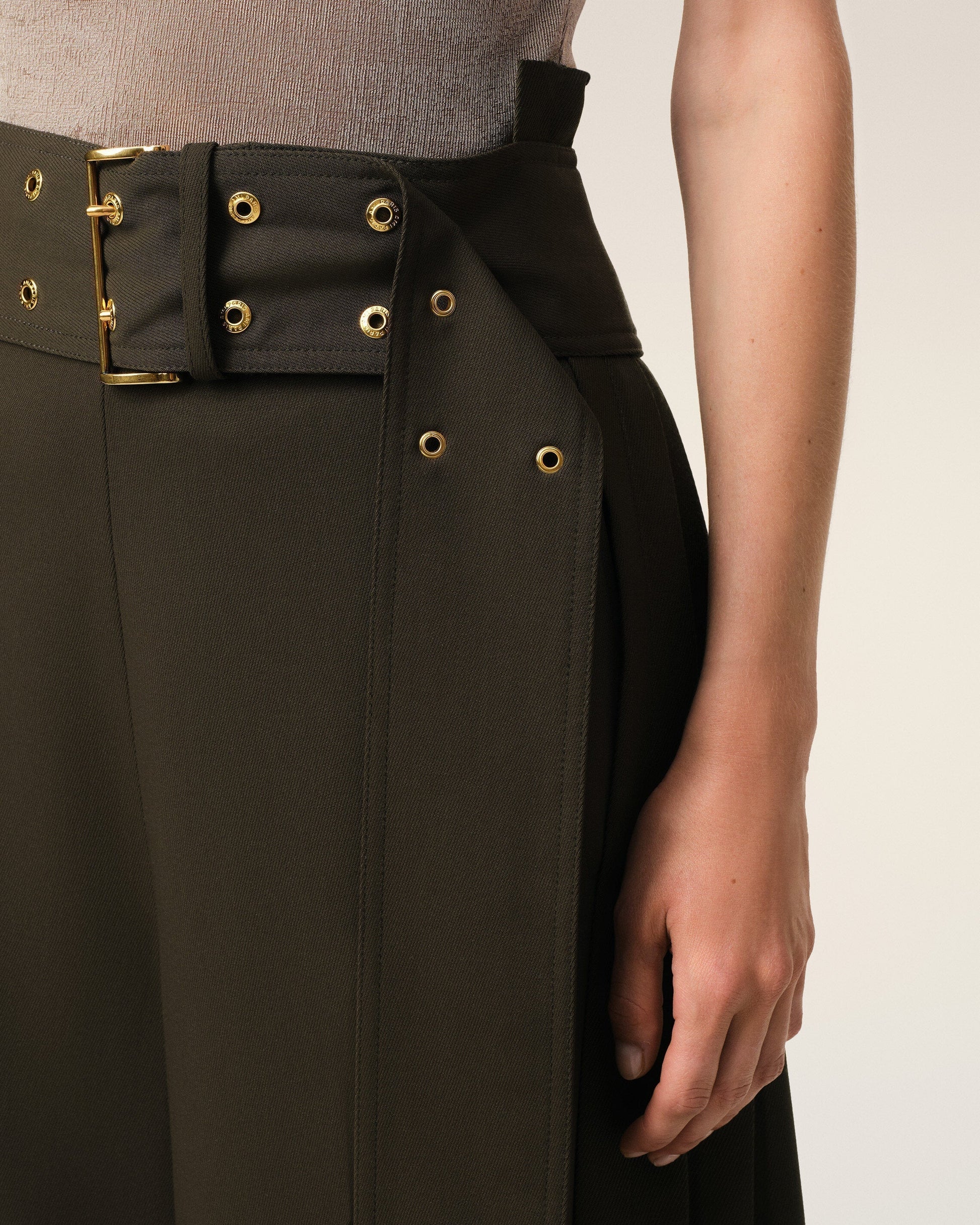 Belted pleated skirt in wool polyester twill. Length below waist 90 cm (size S) Buckle at waist with eyelets in gold color Can be worn low or regular waist thanks to adjustment buttons in waistband Permanent pleats Made in Romania (with love) REF: FSK256.PL0012.377