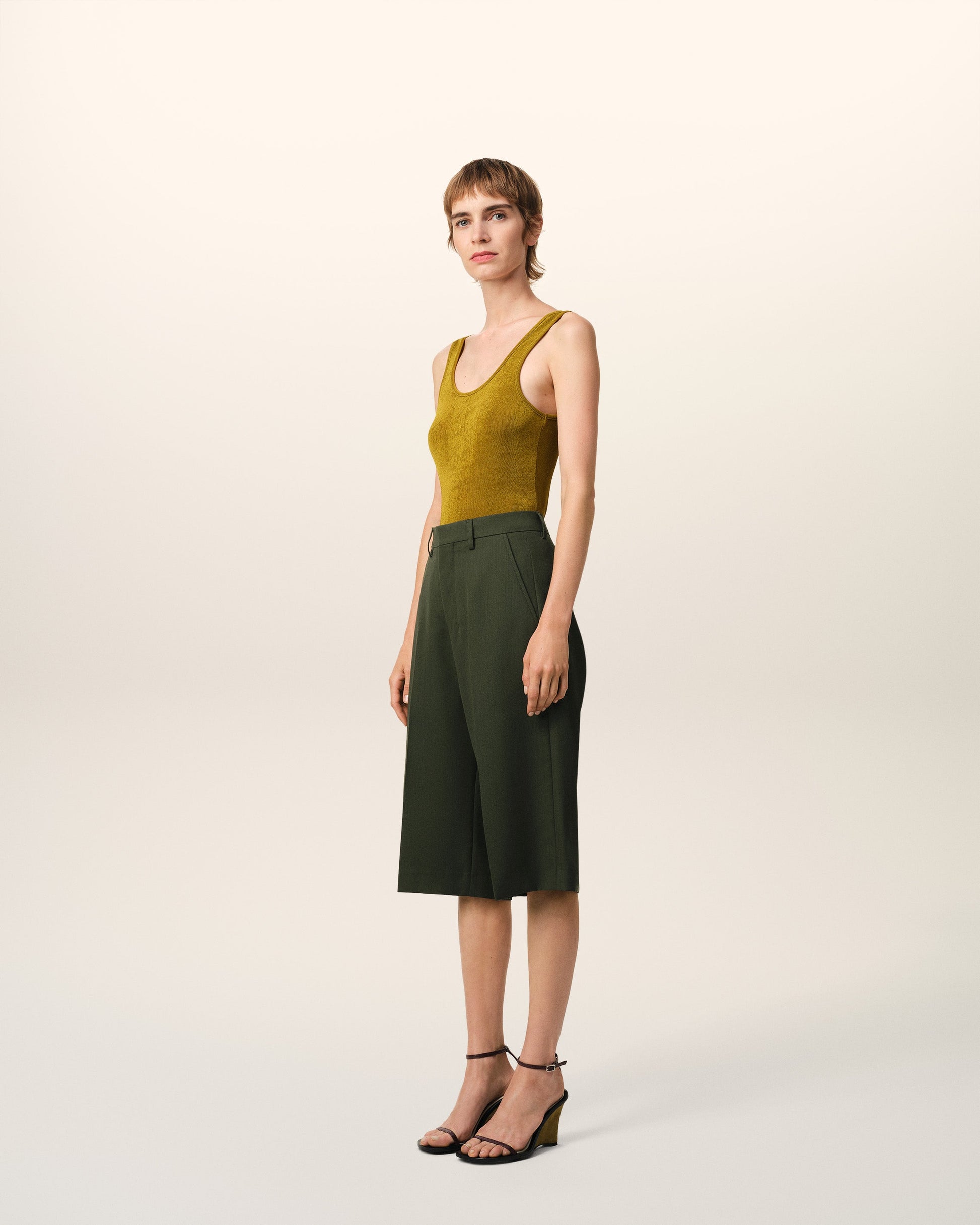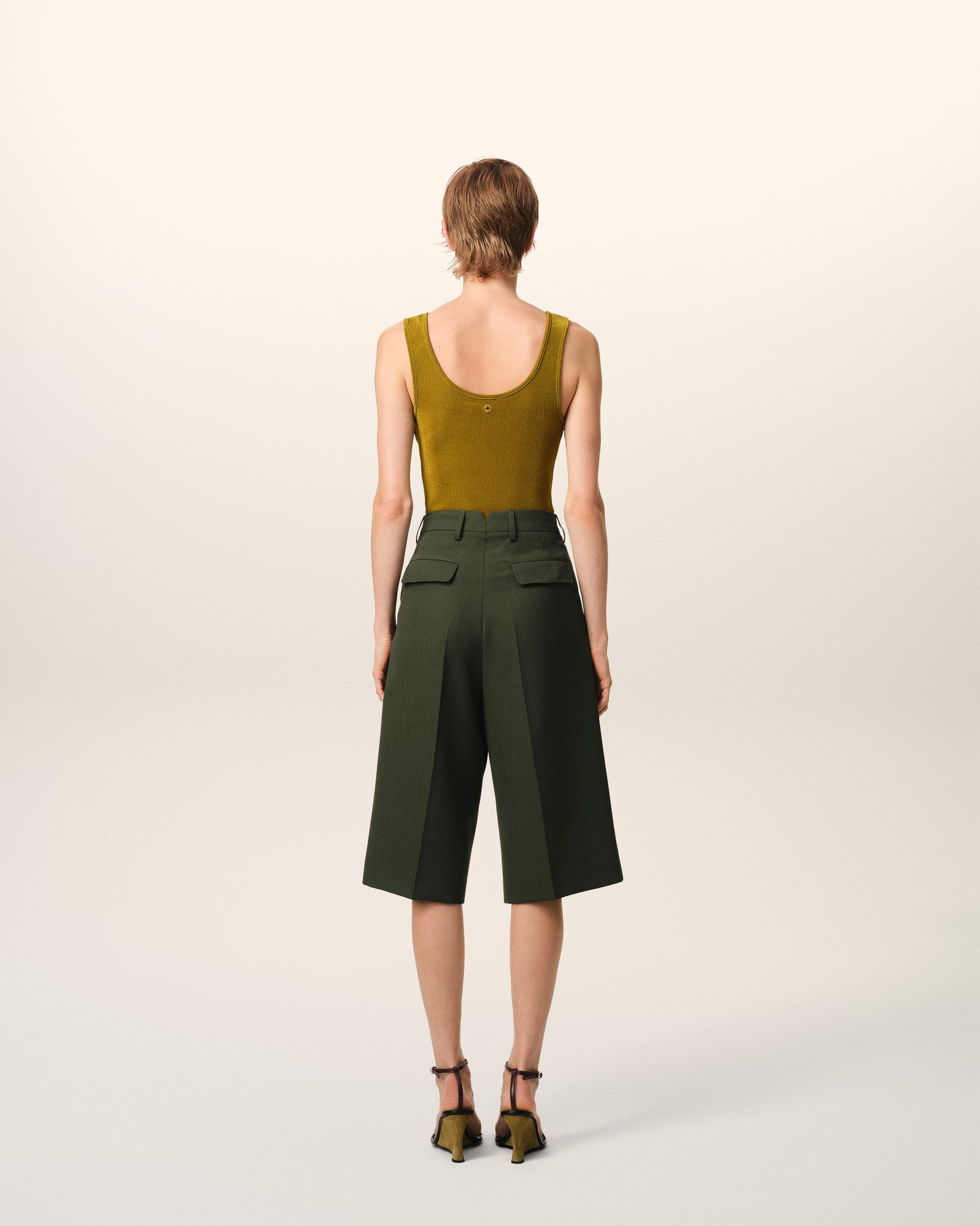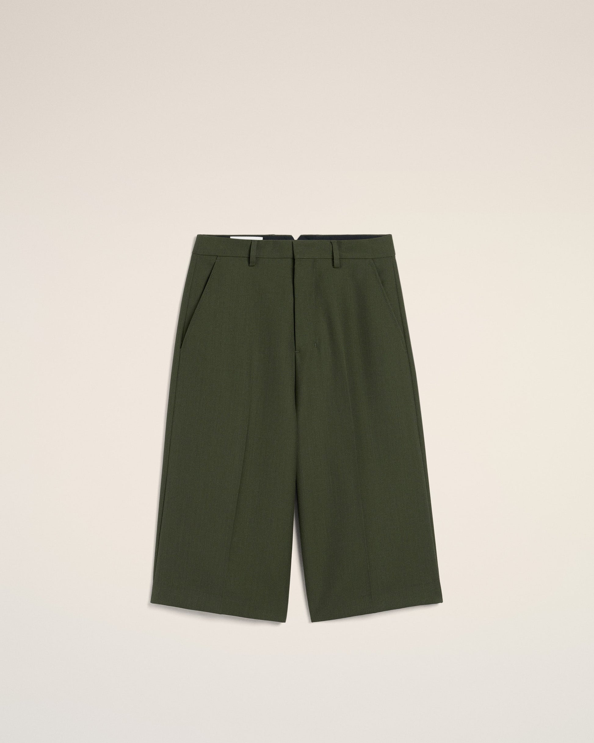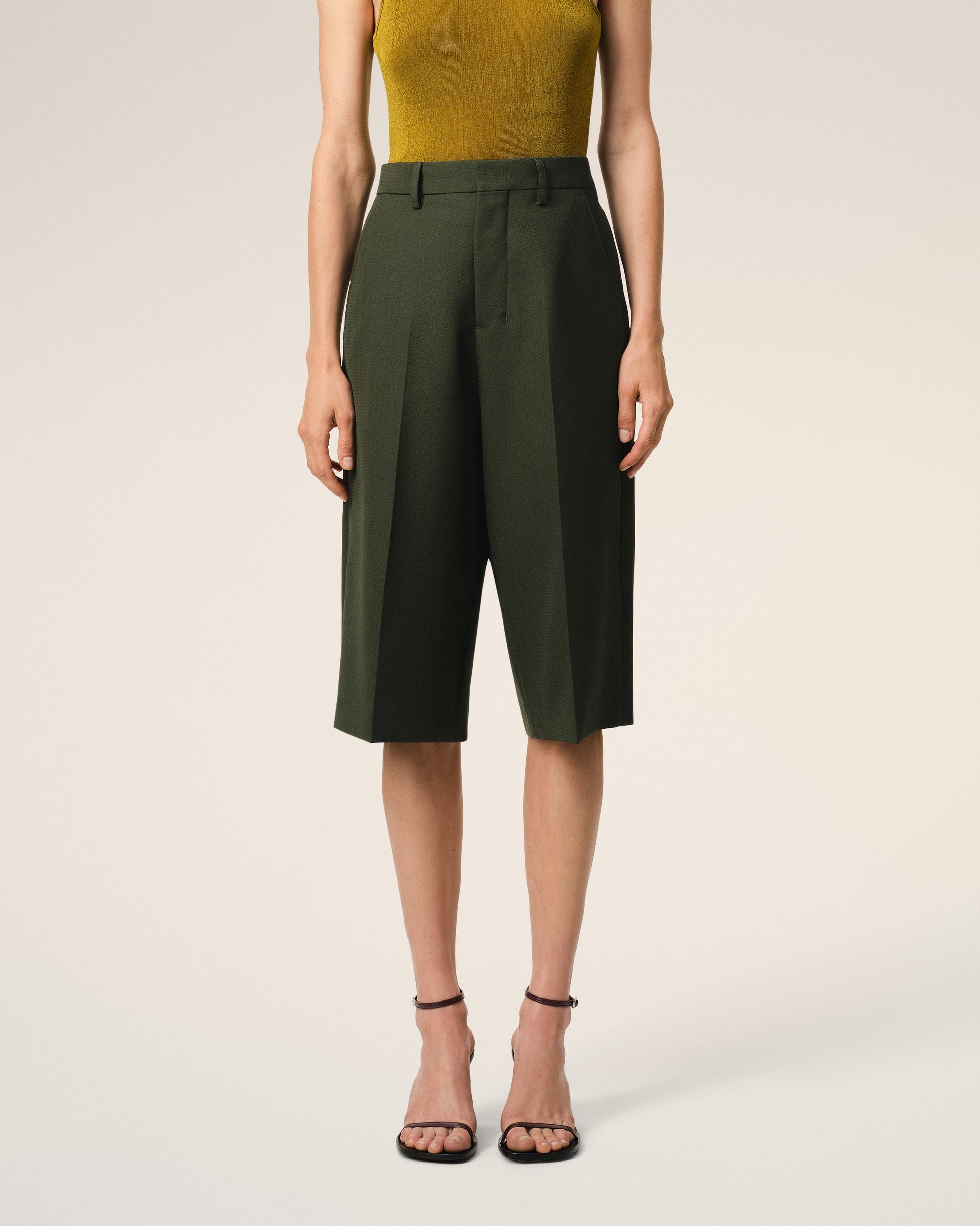 Wide bermuda in fluid wool canvas. Wide fit 30 cm bottom leg width (size 36) 65 cm leg length under the belt (size 36) Front lining to knees Side pockets Back flap pockets with invisible snap buttons "ami" waistband Zipped fly Made in Italy (with love) REF: FSO509.WV0068.376