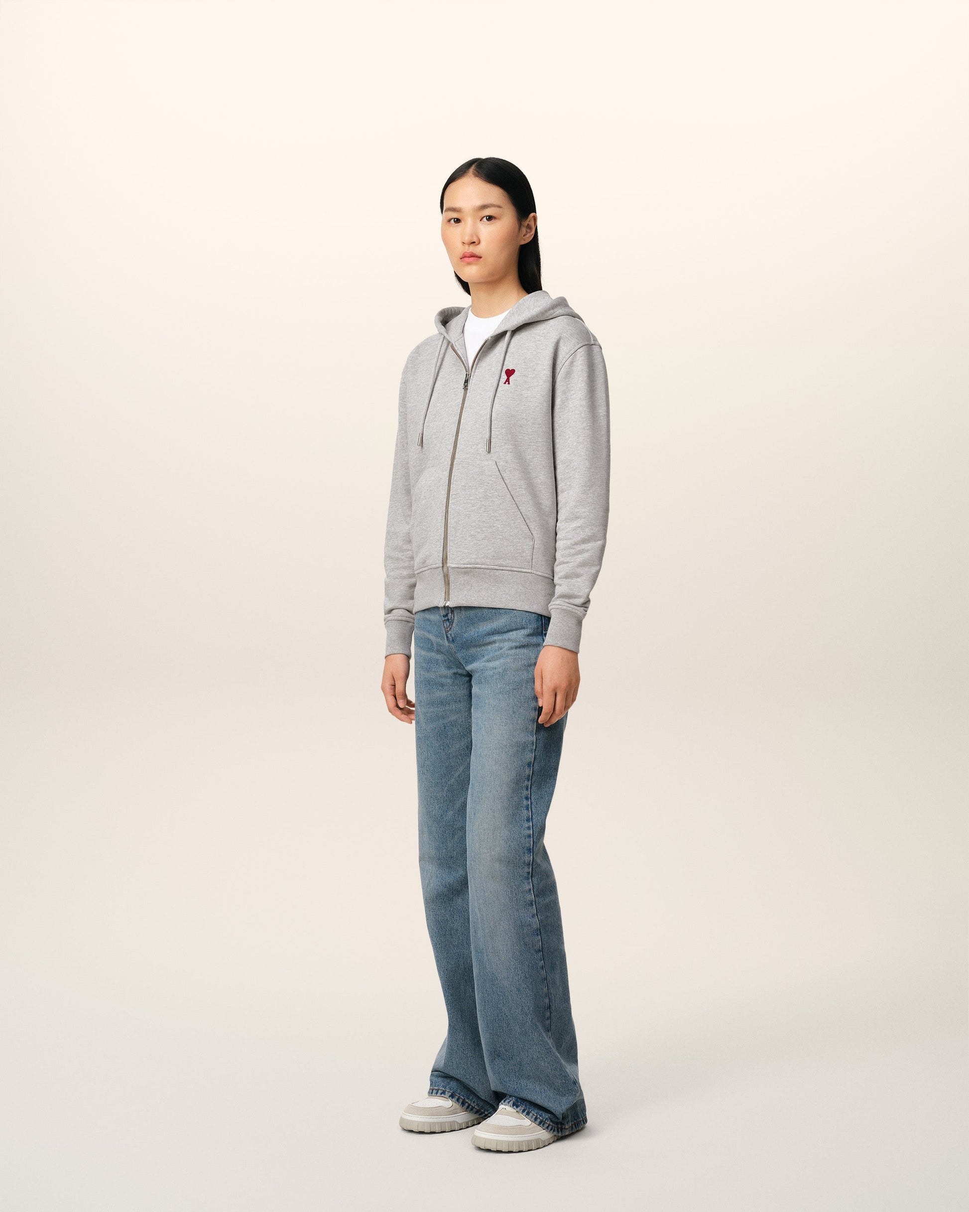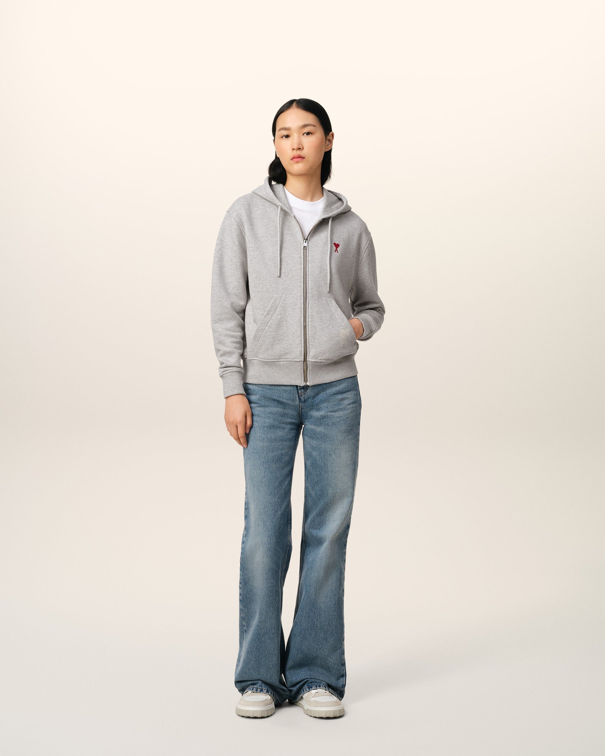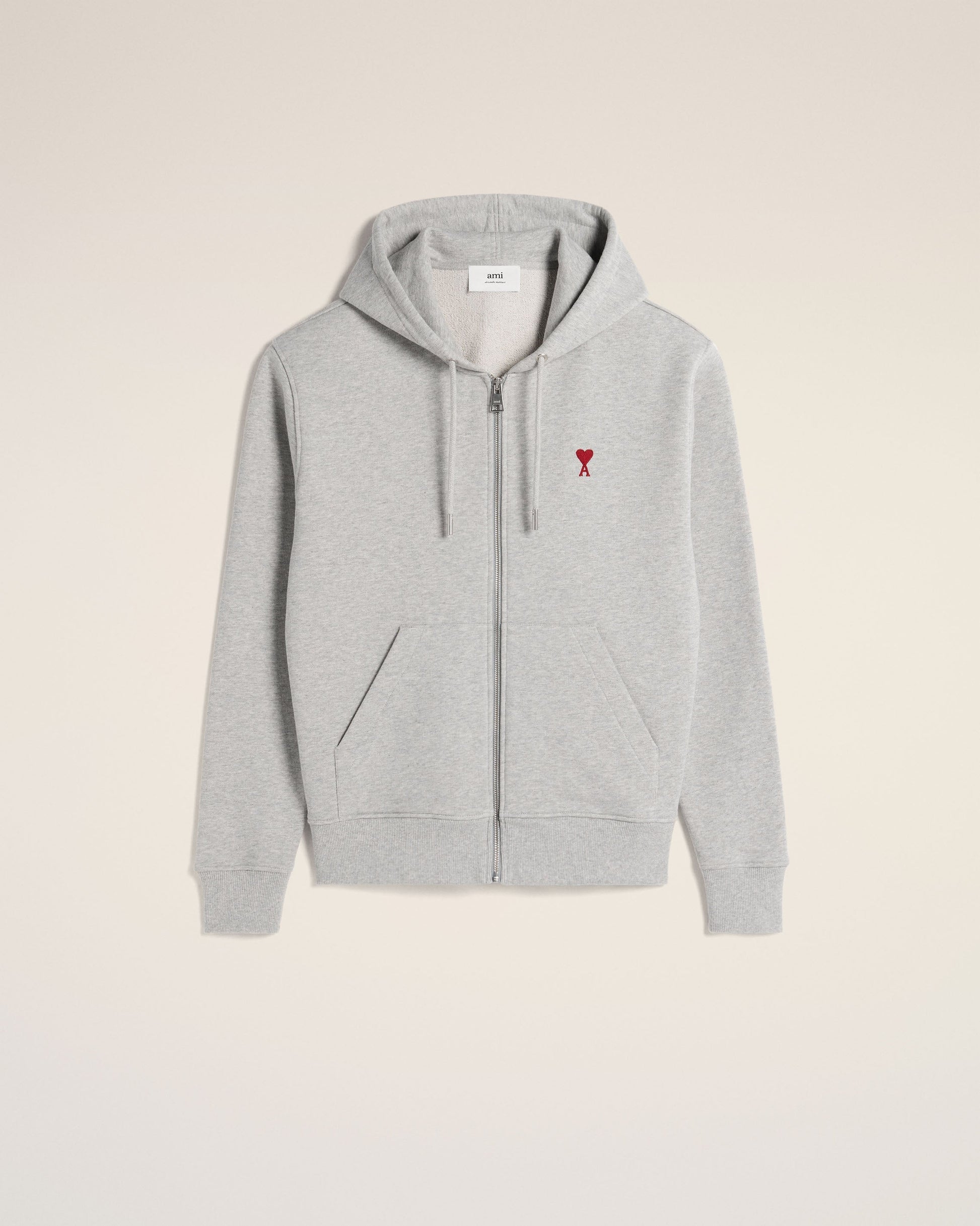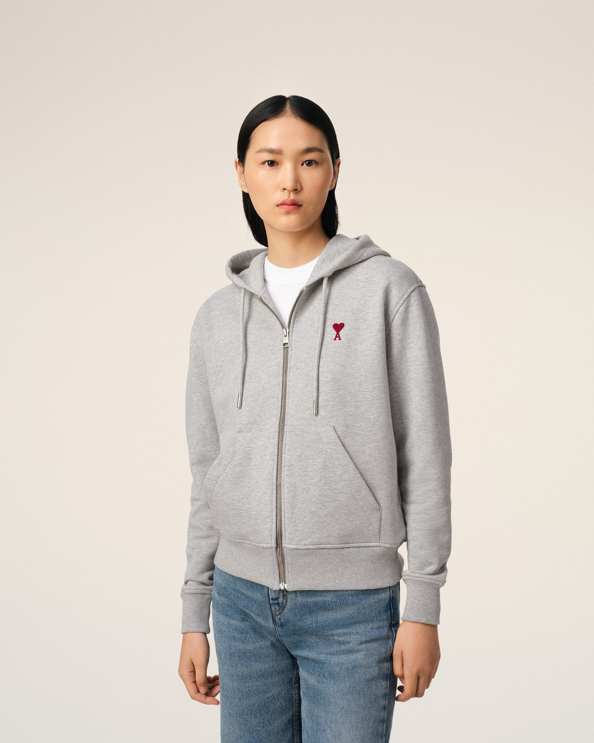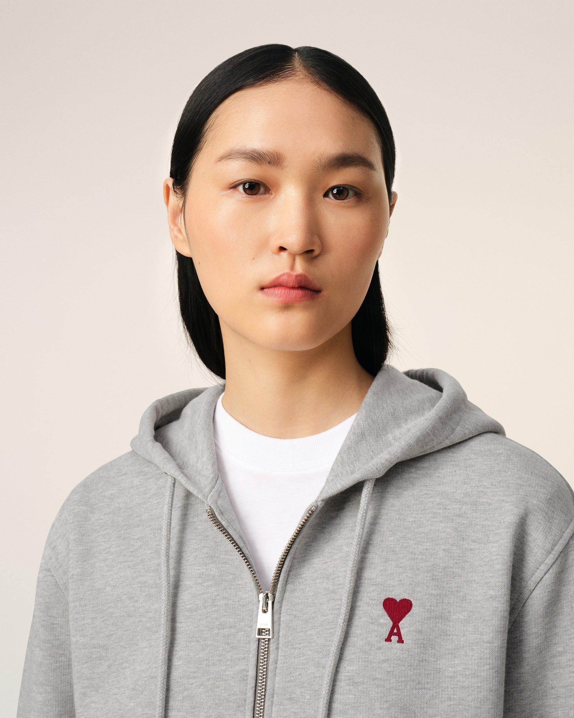 Zipped Ami de Coeur hoodie in loopback organic cotton fleece. Classic fit Unisex product 61 cm center back length (size XS) 69 cm center back length (size M) Red Ami de Coeur chest embroidery Tonal "AMI" embroidery under back neckline Nickel color metal ends and engraved eyelets Nickel color metal zipper Puller ami engraved Made in Portugal (with love) REF: BFUSW435.730.0951