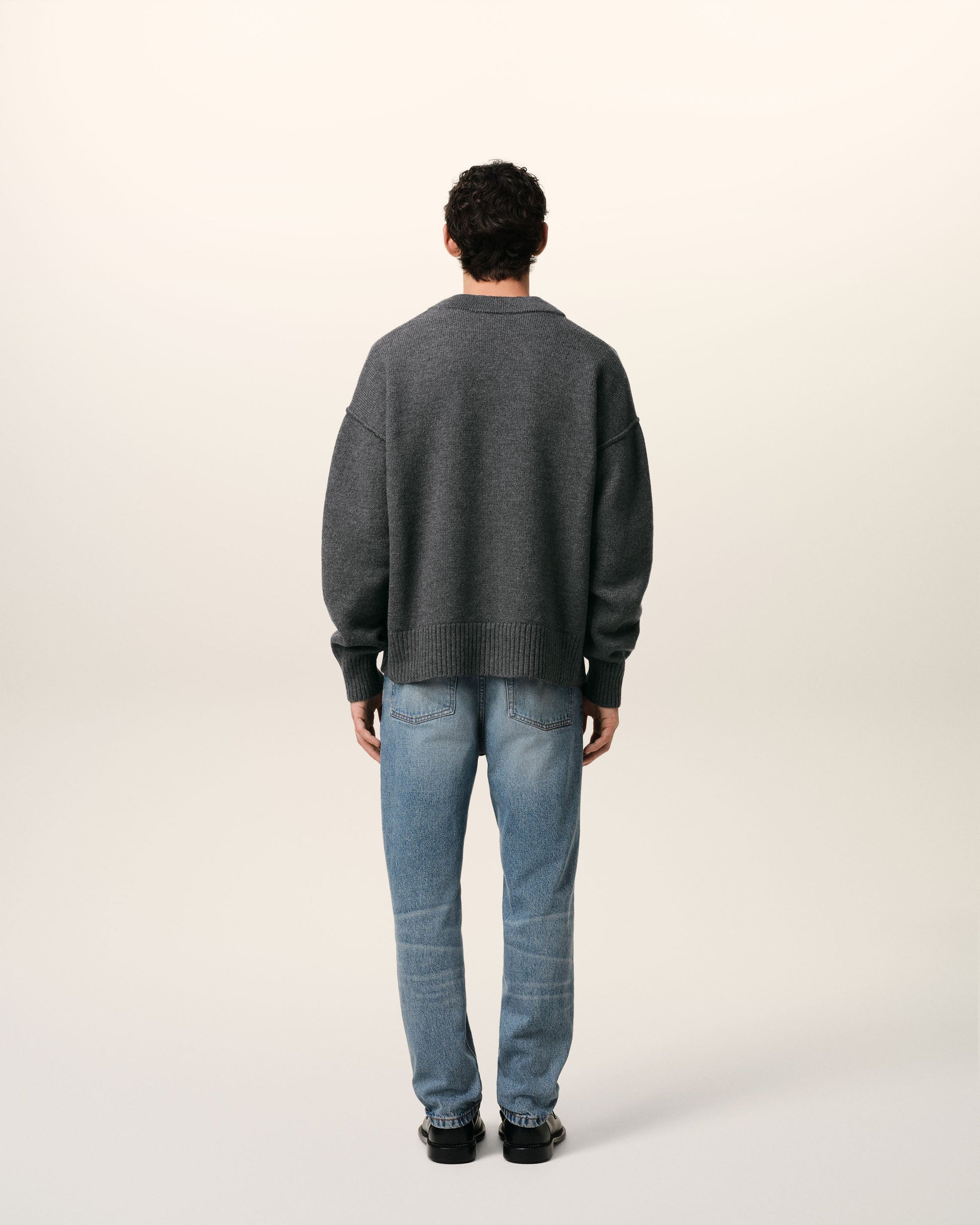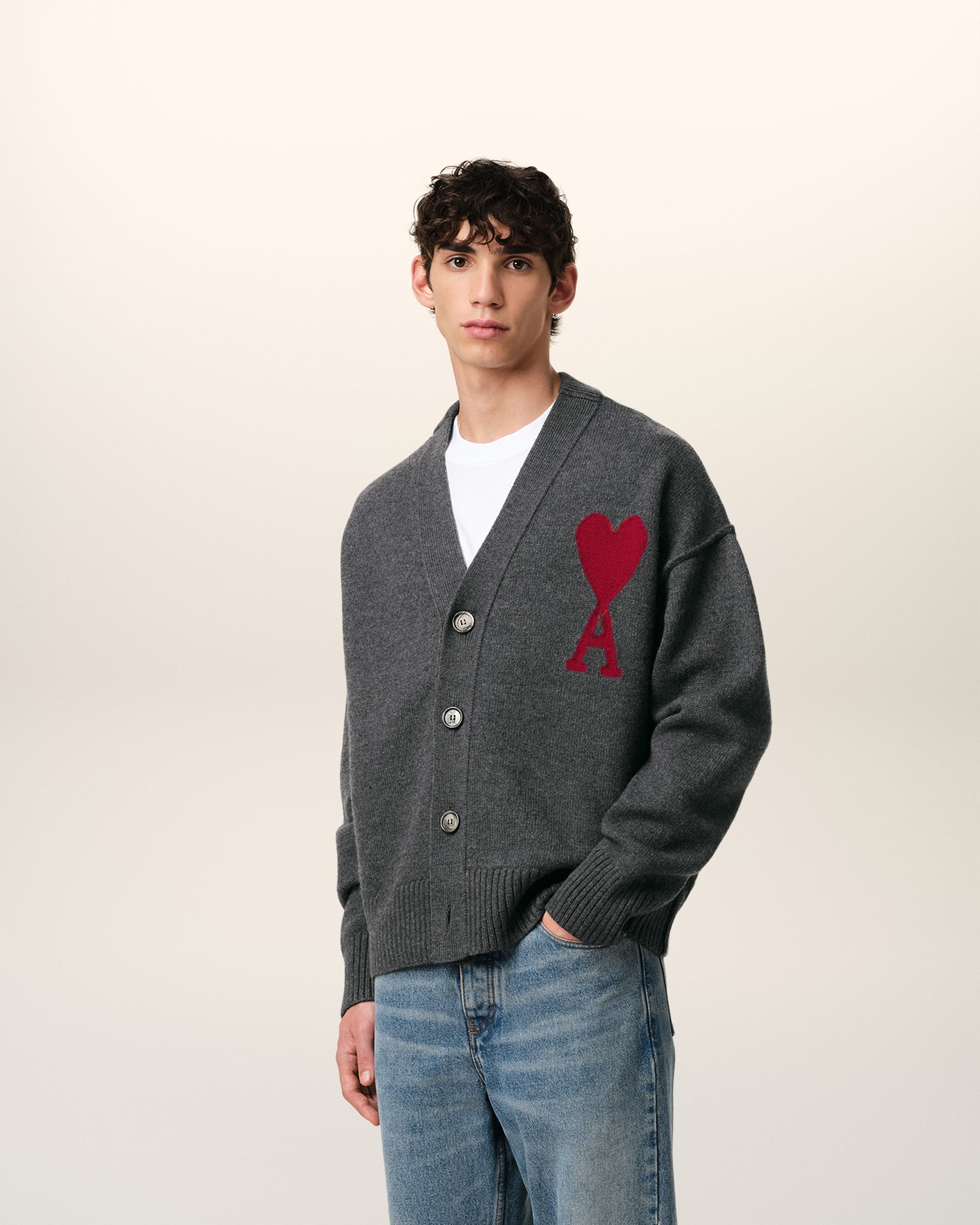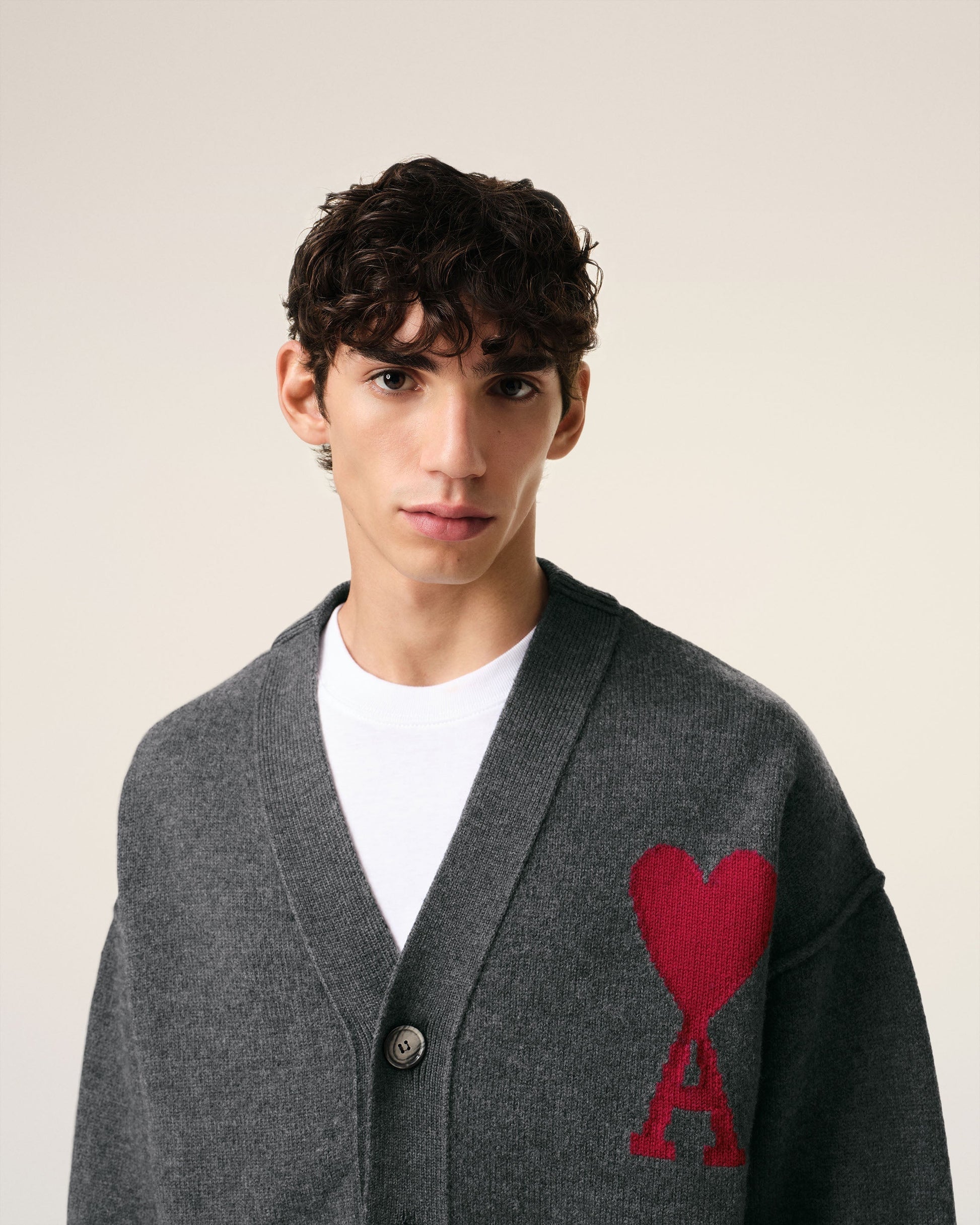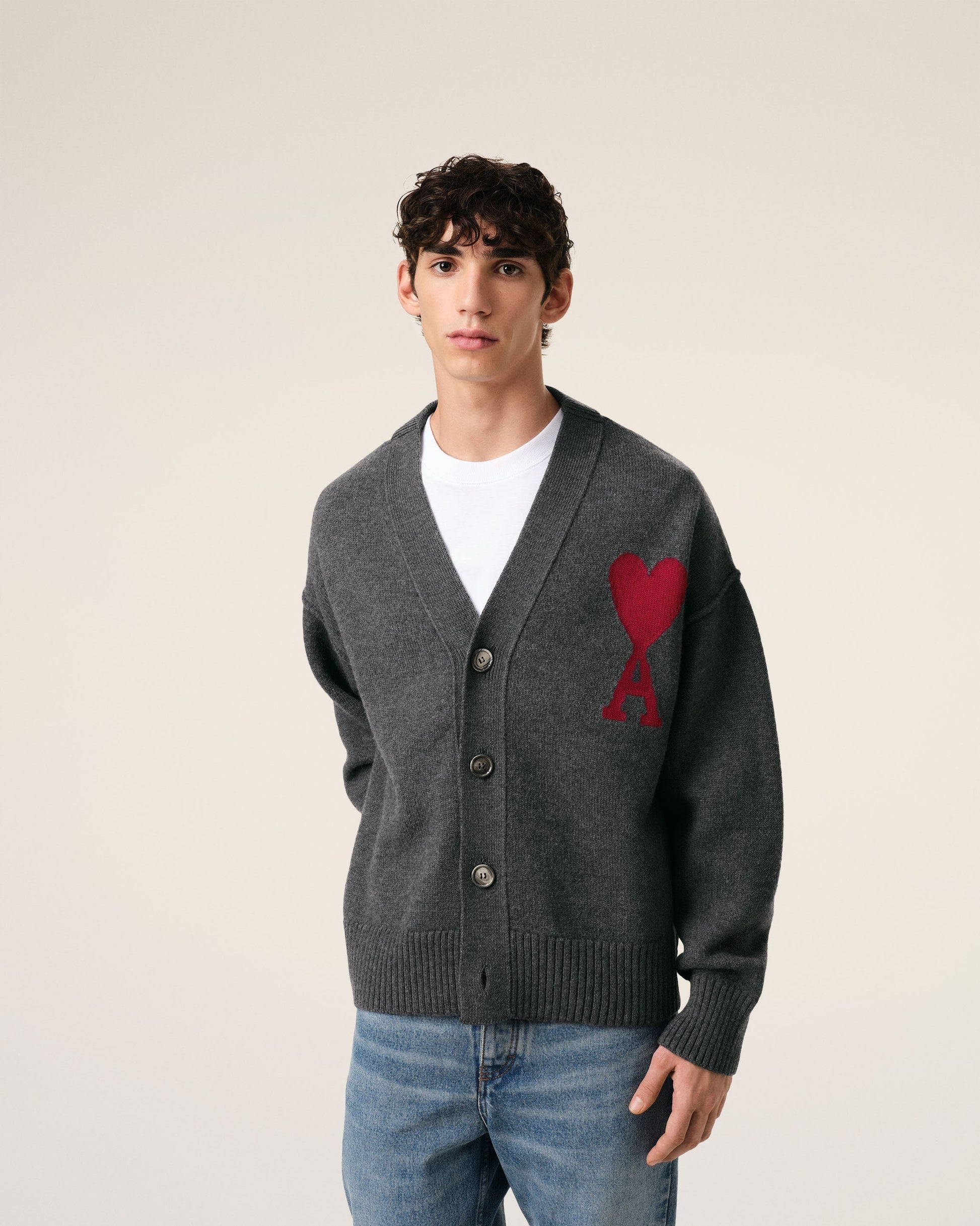 Cardigan in felted merino wool. Unisex product Jersey stitch Intarsia-knitted red Ami de Coeur on the chest Inside out seams 64 cm center back length (size M) 58 cm center back length (size XS) Made in Portugal (with love) REF: BFUKC006.018.084
