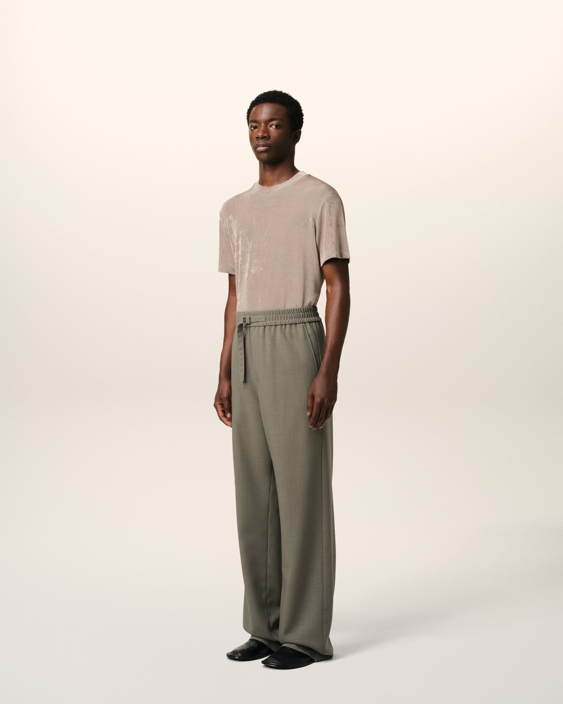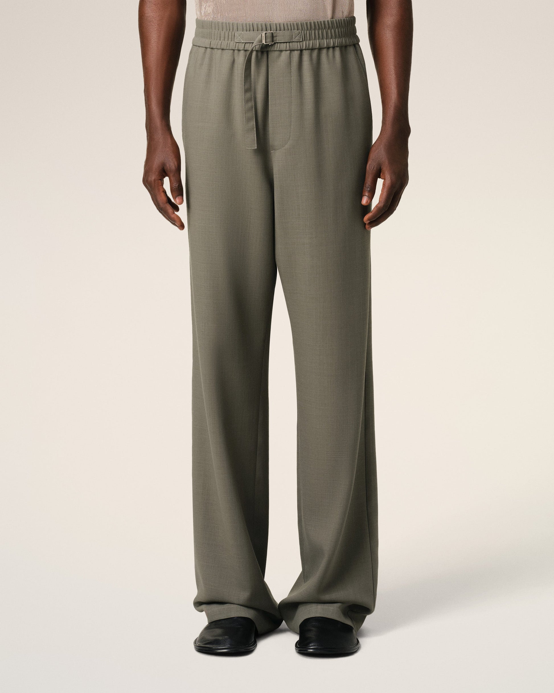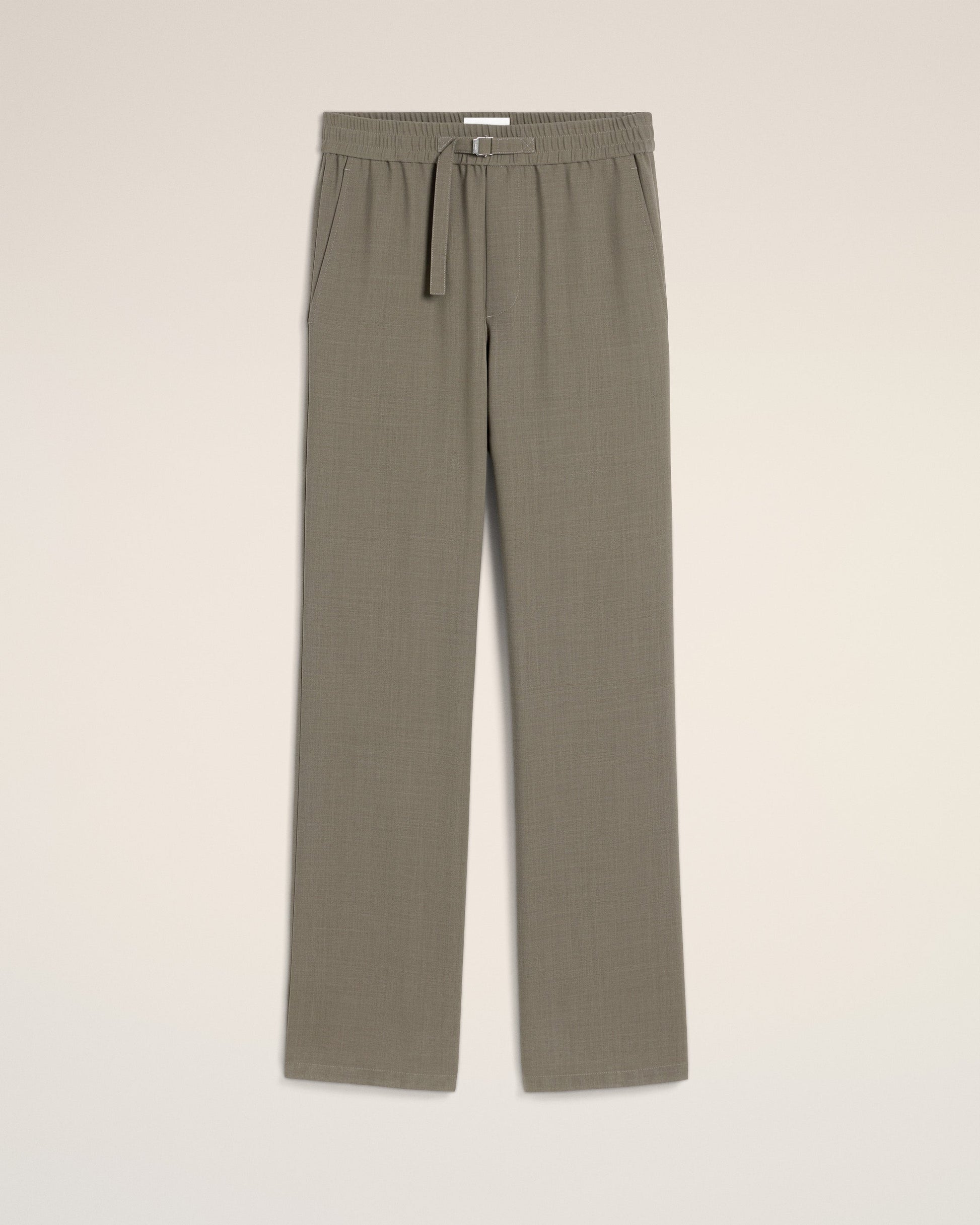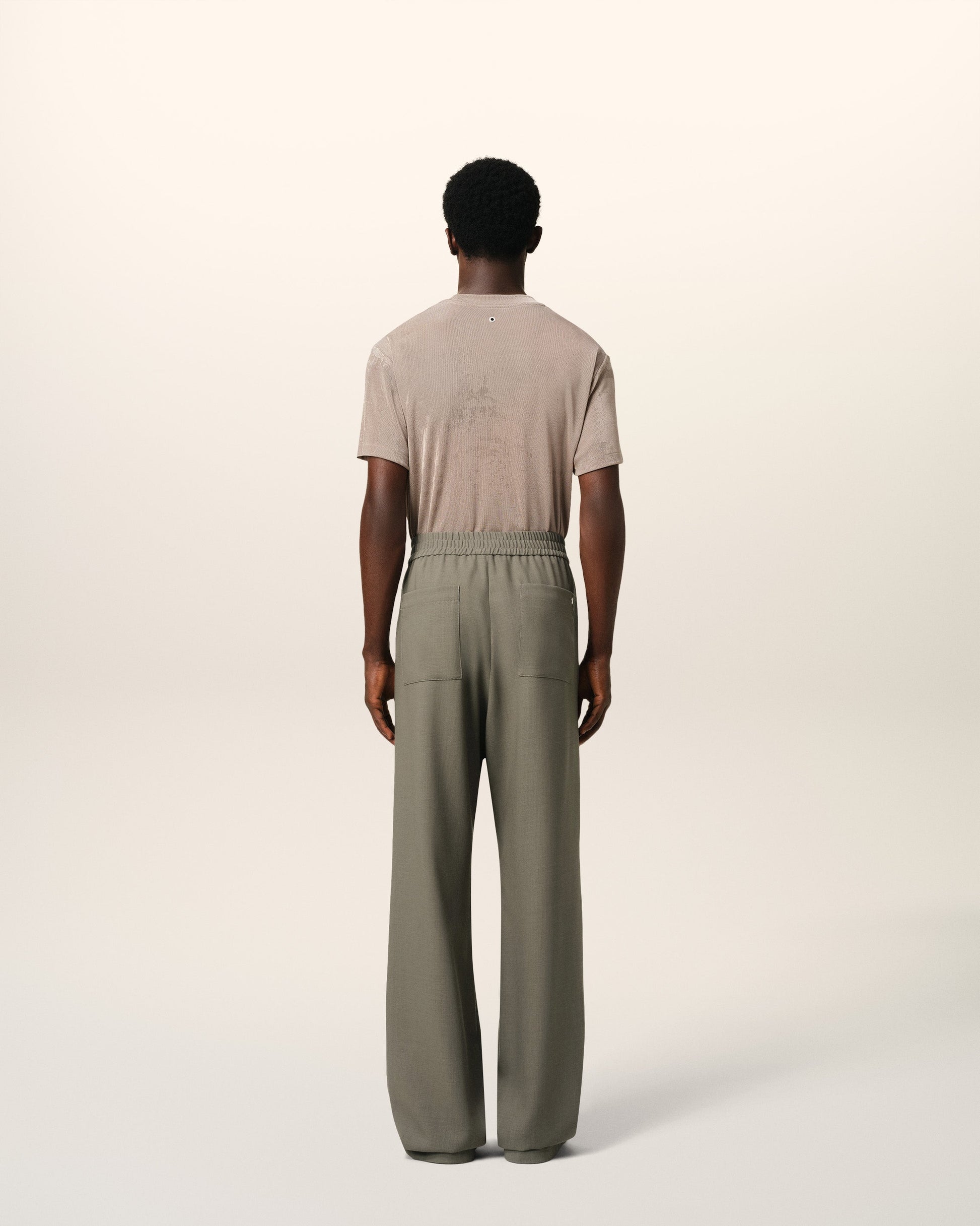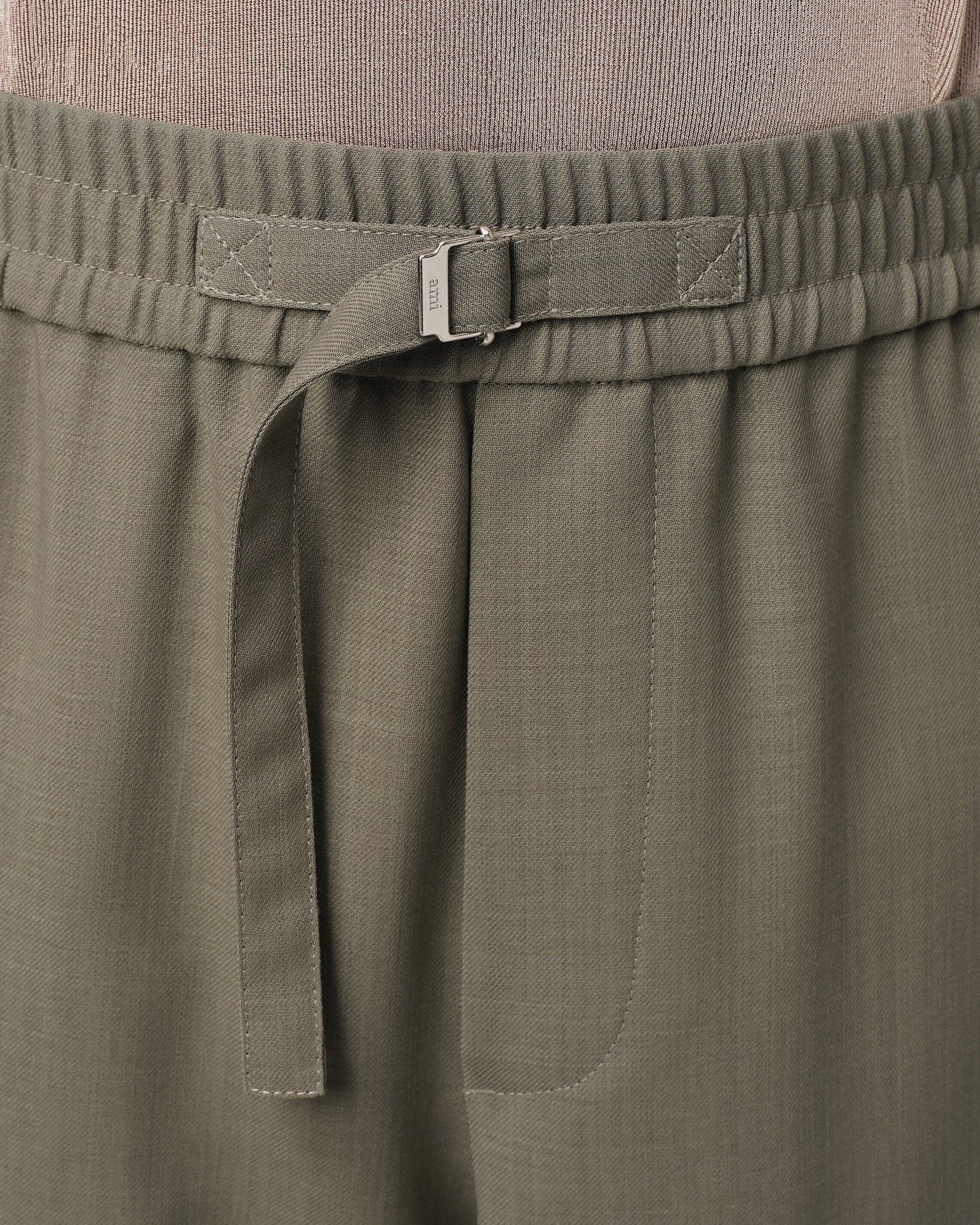 Straight fit elasticated trousers in light wool gabardine. 28 cm bottom leg width (size M) Elasticated waist Straight leg Strap with buckle in nickel color Fake fly without buttons Patch pockets on the back Ami de Coeur rivet on the back pocket Made in Romania (with love) REF: HTR214.WV0066.0953