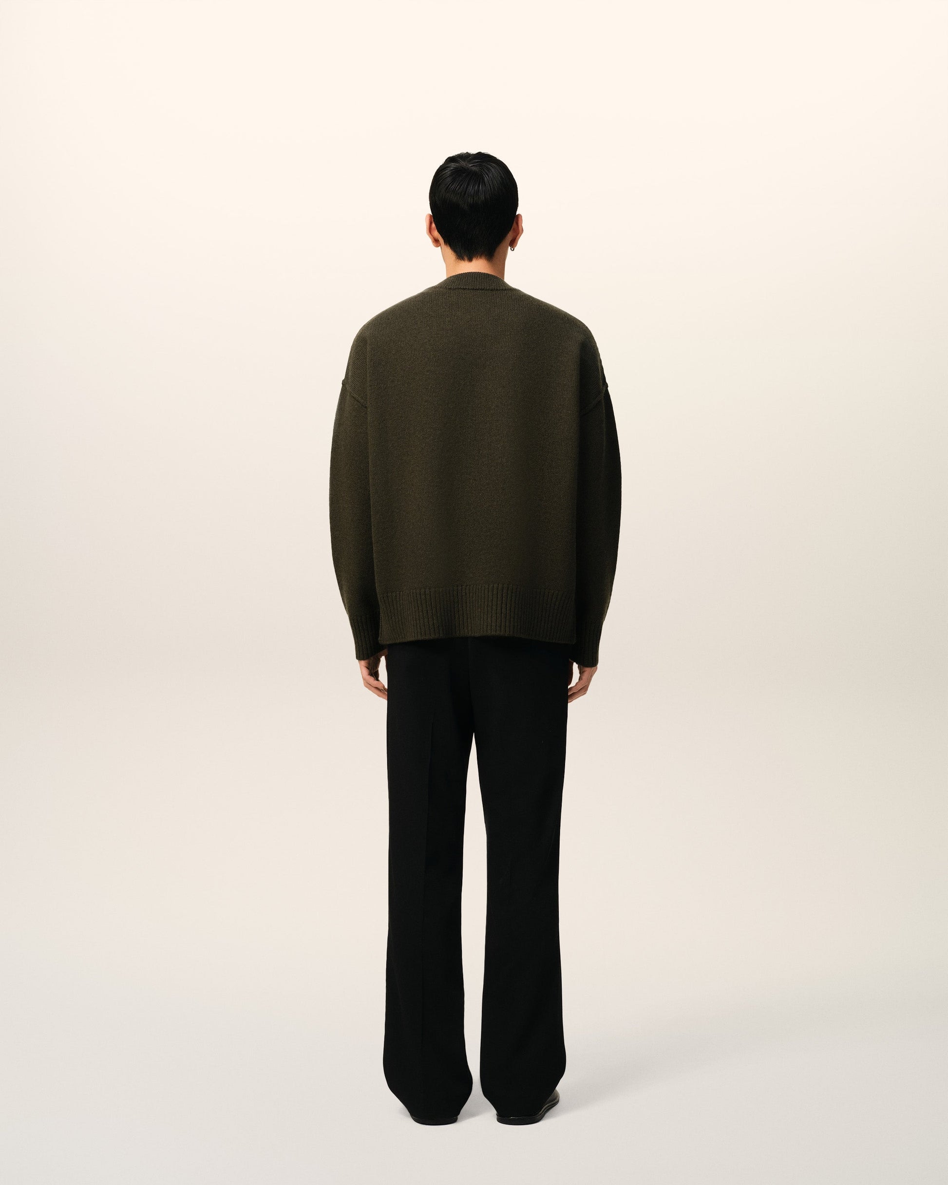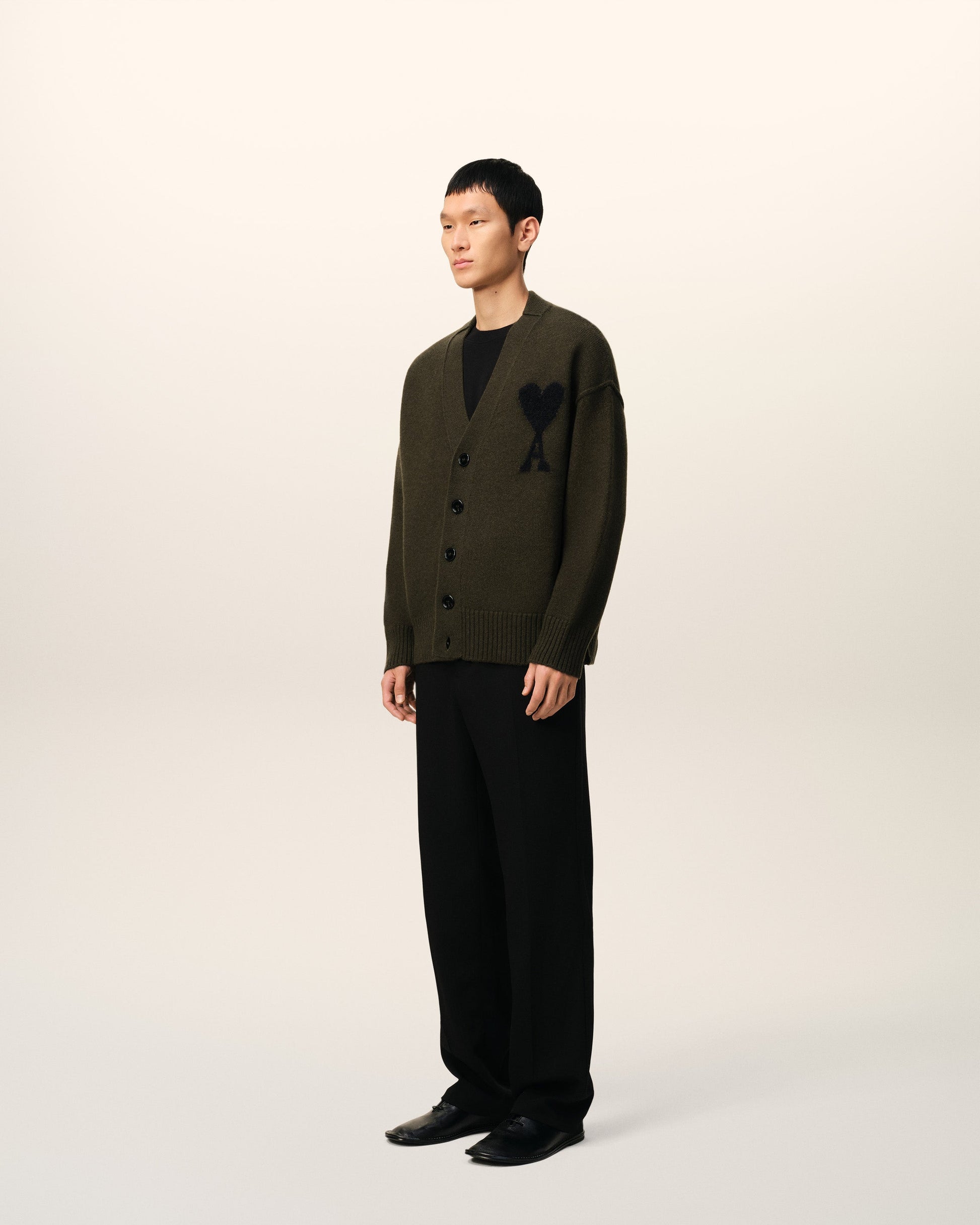 Cardigan in felted merino wool. Unisex product Intarsia knitted black Ami de Coeur on the chest Inside out seams 62 cm center back length (size M) 56 cm center back length (size XS) Horn buttons Made in Italy (with love) REF: SPUKC018.018.024
