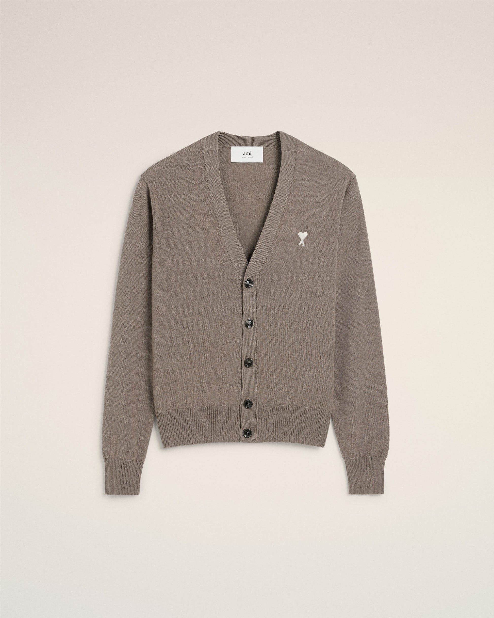 Cardigan in classic merino wool. Jersey stitch Off-white Ami de Coeur chest embroidery 64 cm center back length (size M) Horn buttons Made in Portugal (with love) REF: HKC121.KN0025.0952