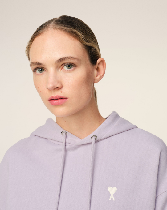 Ami de coeur cropped hoodie in organic cotton fleece. Cropped fit 57 cm center back length (size S) Off-white Ami de Coeur chest embroidery Tonal "AMI" embroidery under back neckline Side drawstrings Nickel color metal ends and engraved eyelets Made in Portugal (with love) REF: FSW260.730.504