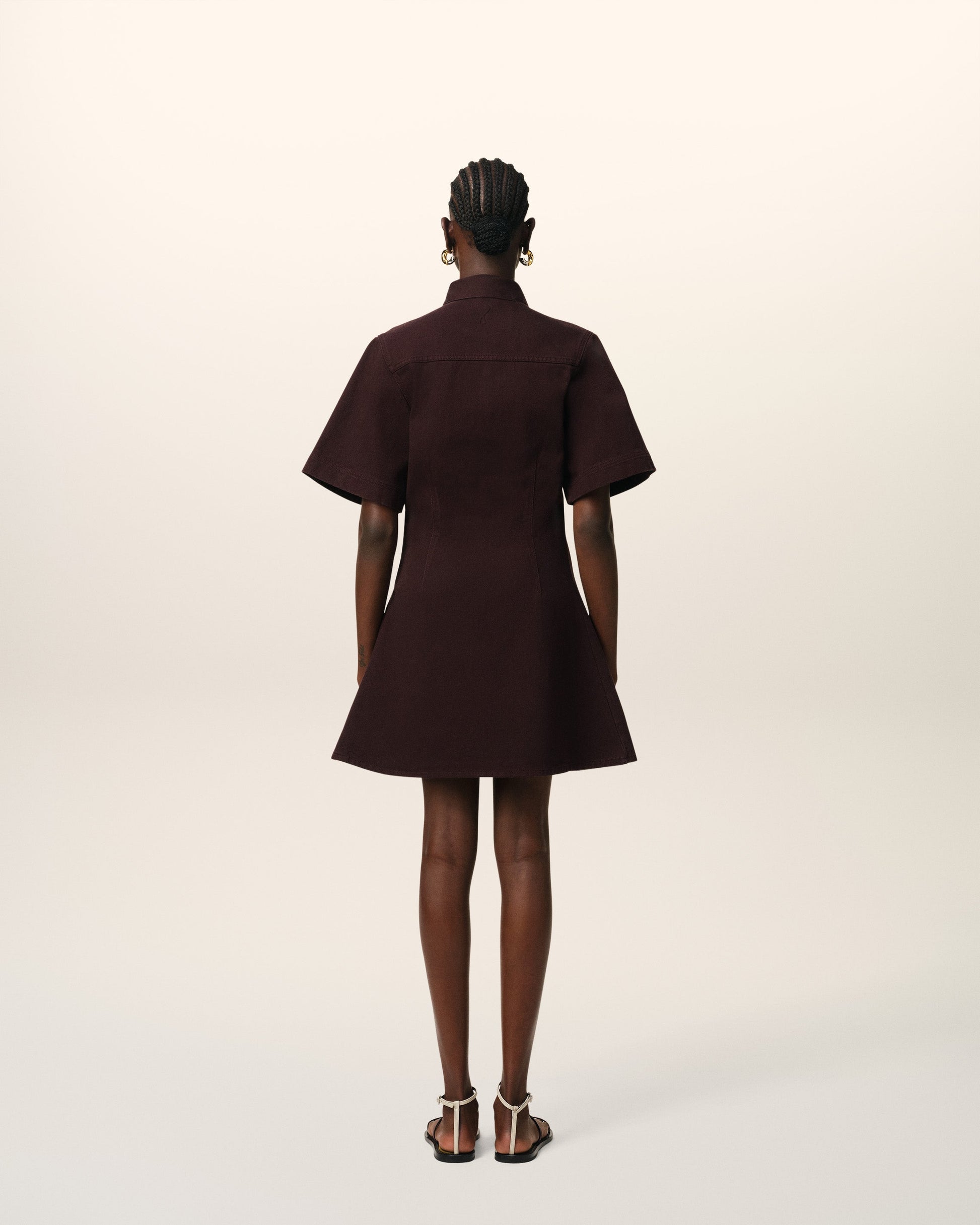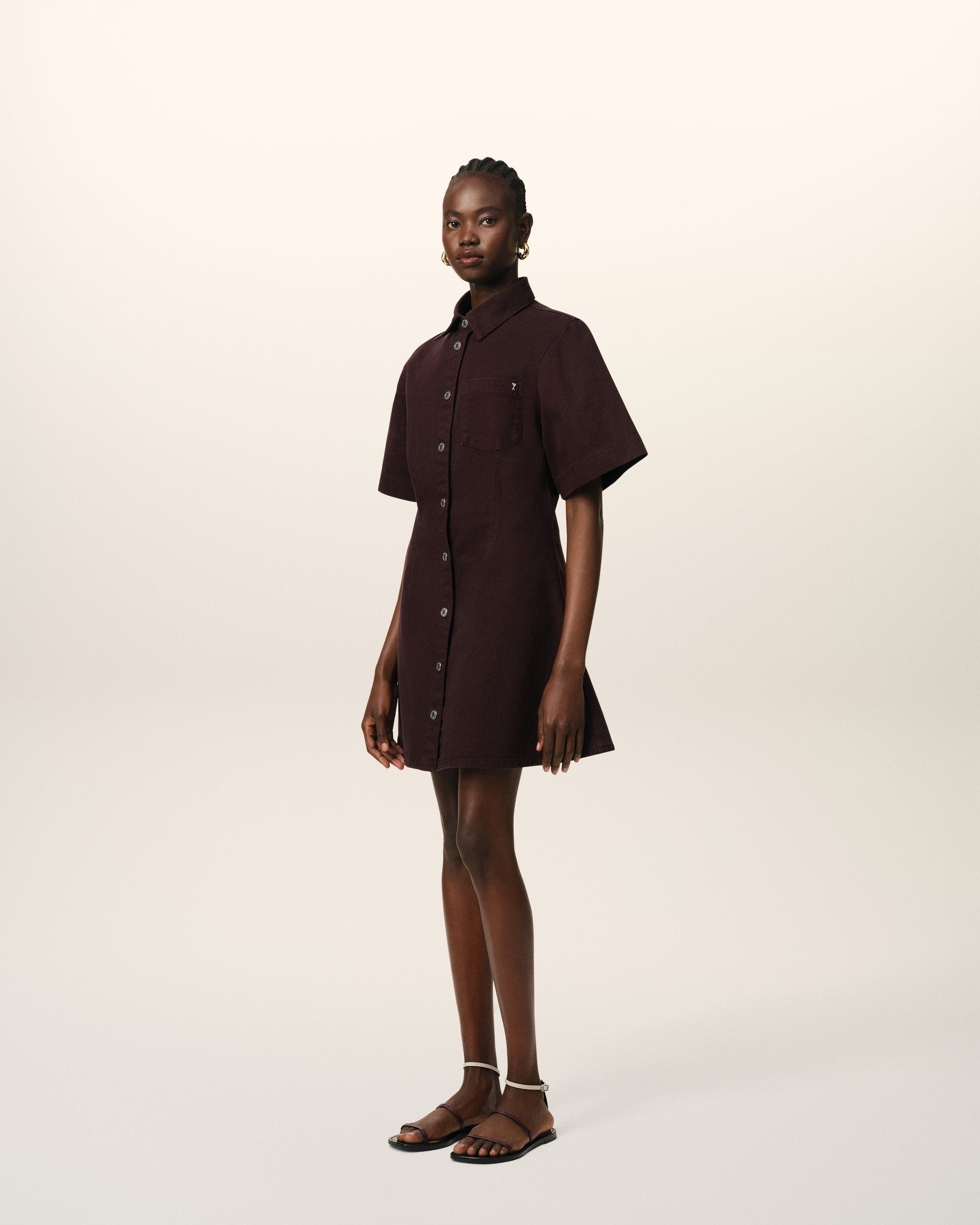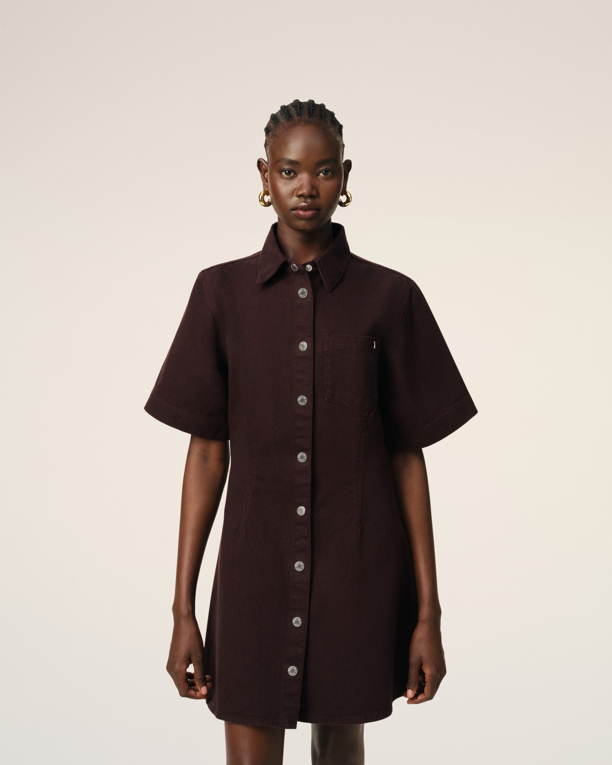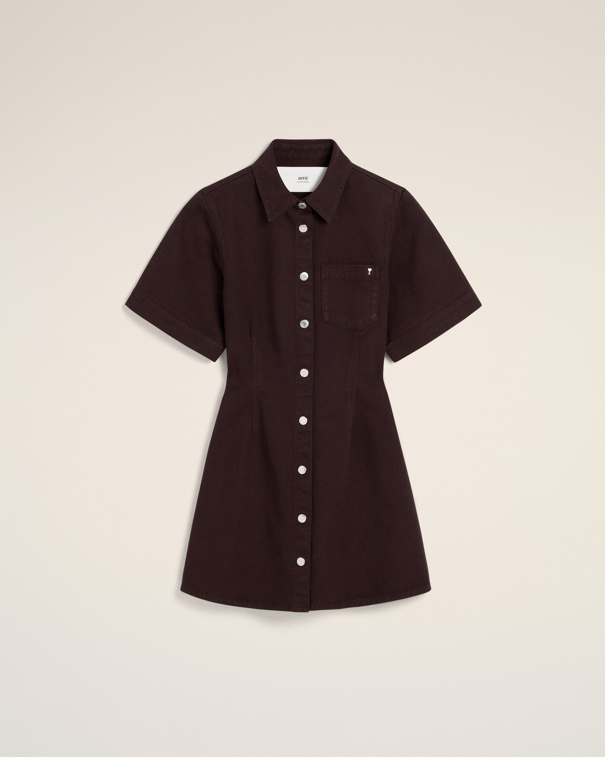 Short sleeve shirt dress in colored cotton twill. Fitted fit 87 cm center back length (size S) Chest pocket Ami de Coeur rivet on chest pocket Denim snap buttons in nickel color Tonal topstitches Made in Portugal (with love) REF: FDR404.DE0034.633