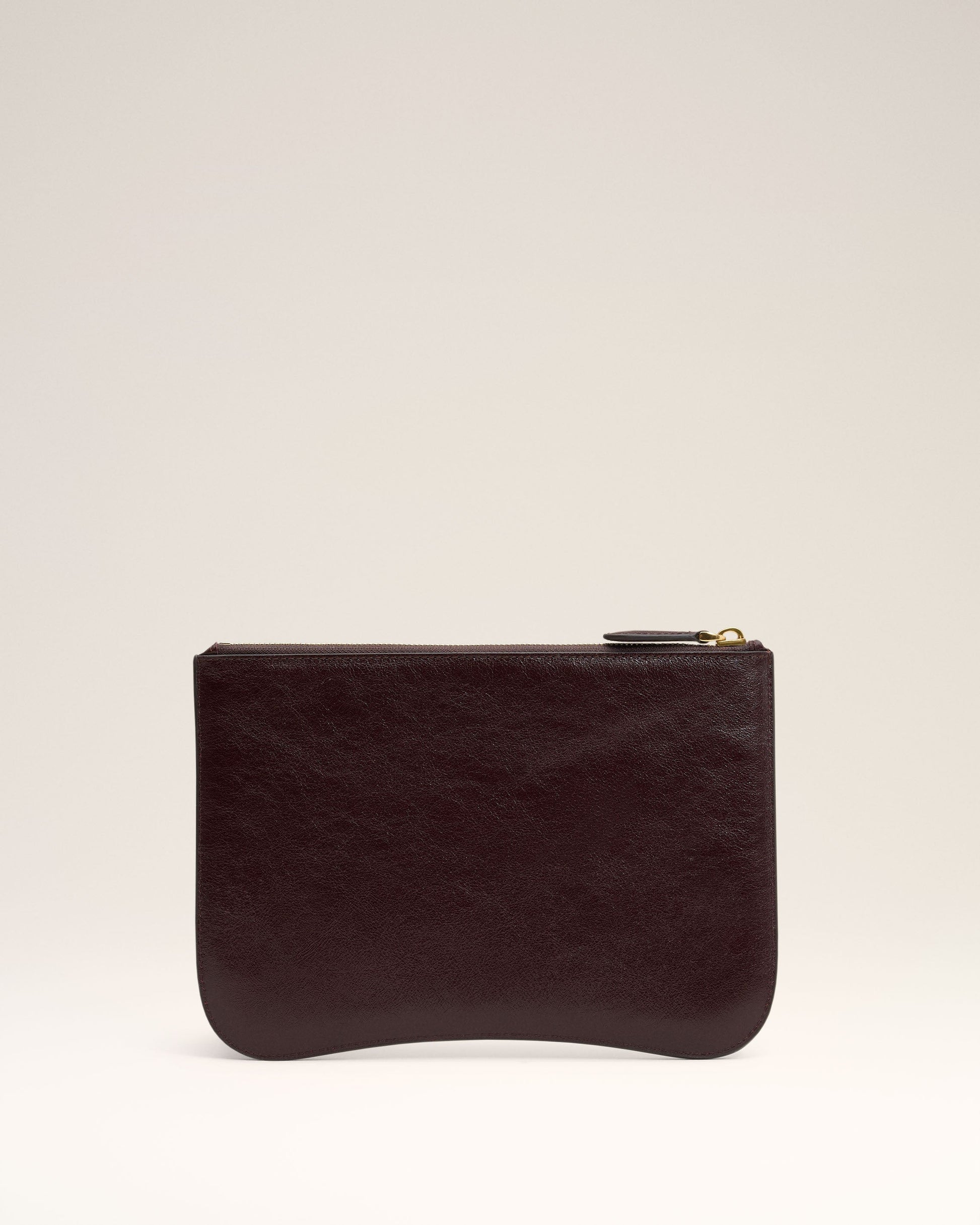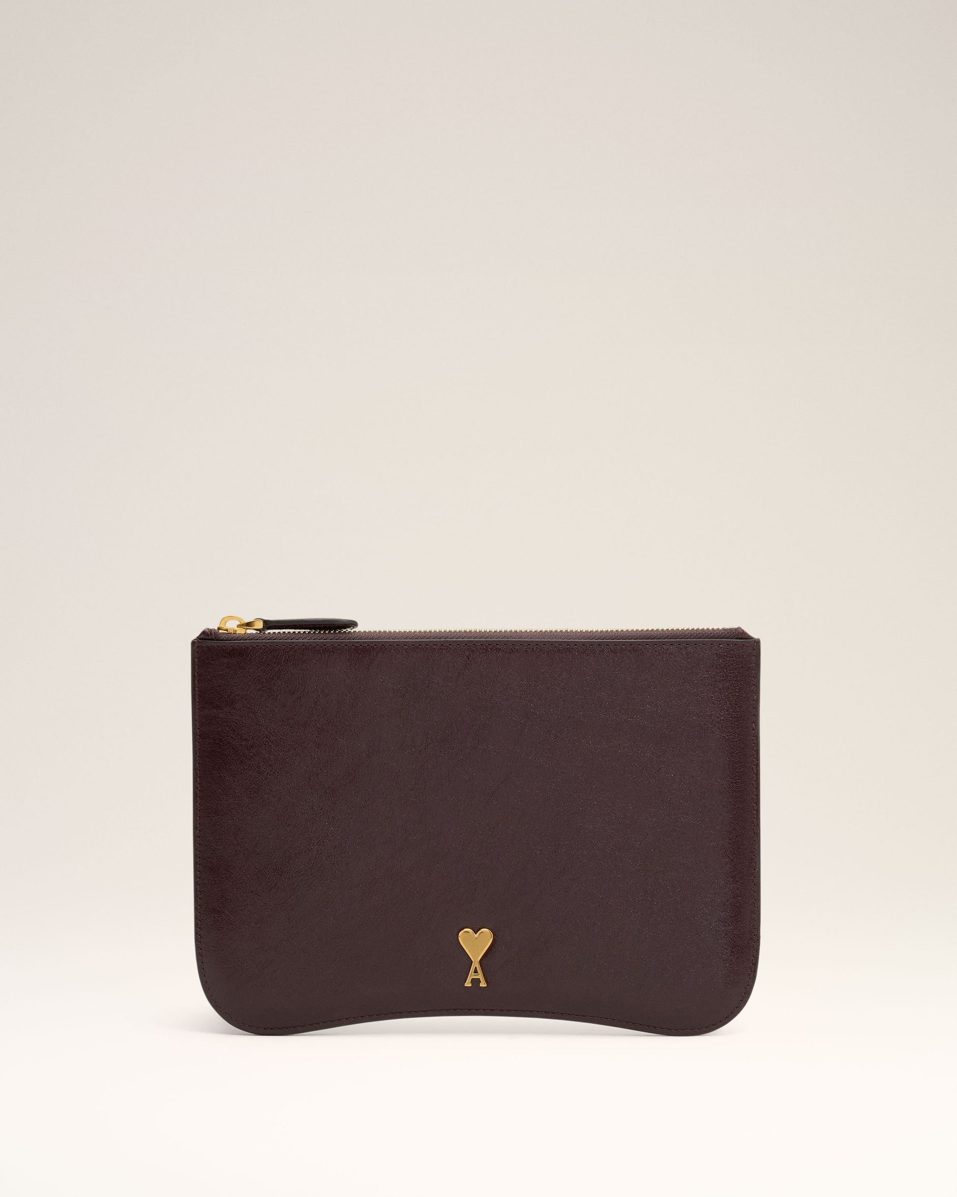 Paris Paris pouch in vegetable-tanned shiny textured leather. Natural patina of the leather Cotton canvas lining Ami de Coeur stud One central compartment with one inside patched pocket Metal hardware in vibrated brass color Size: 25x17.5 cm Made in Morocco (with love) REF: USL025.AL0051.633