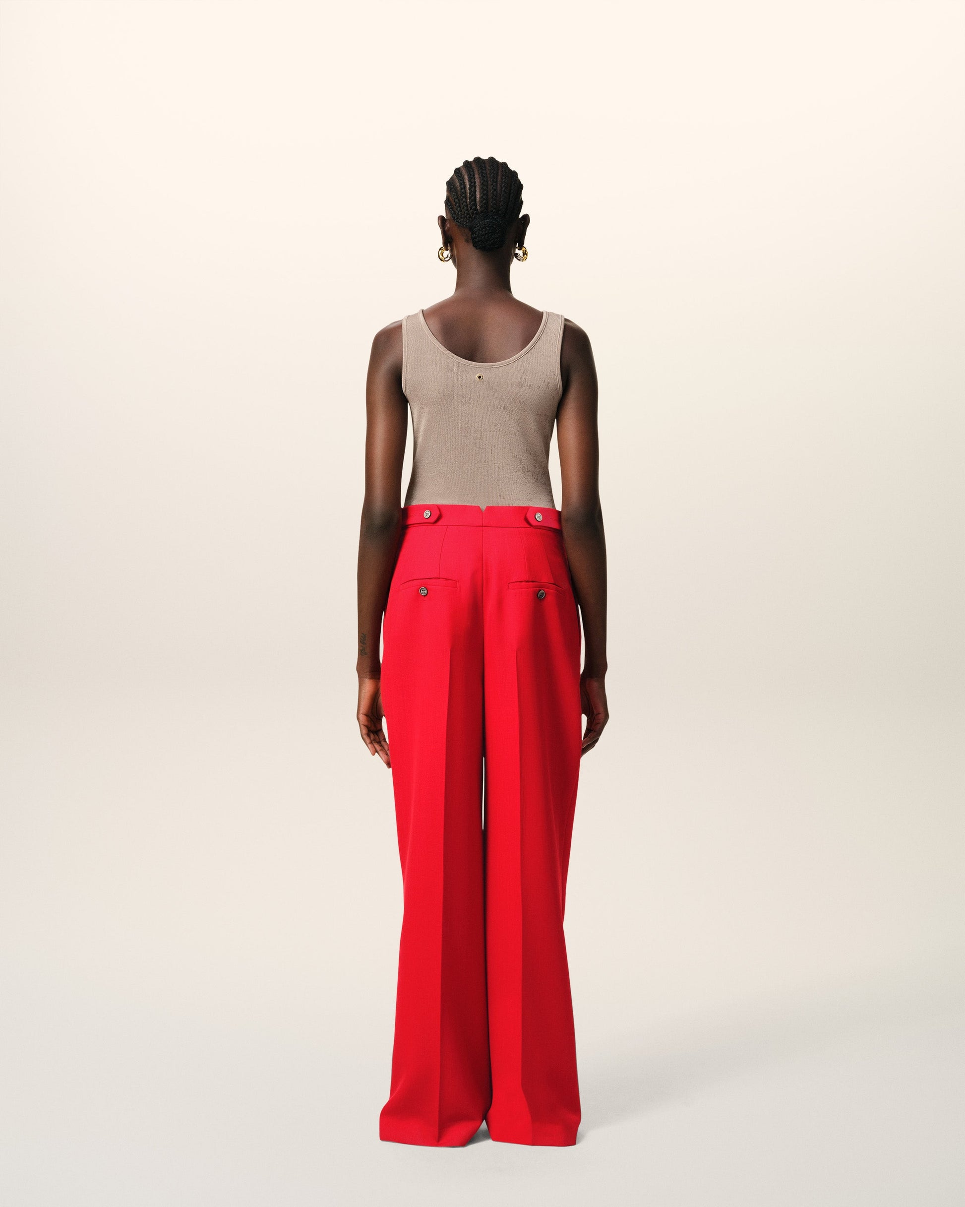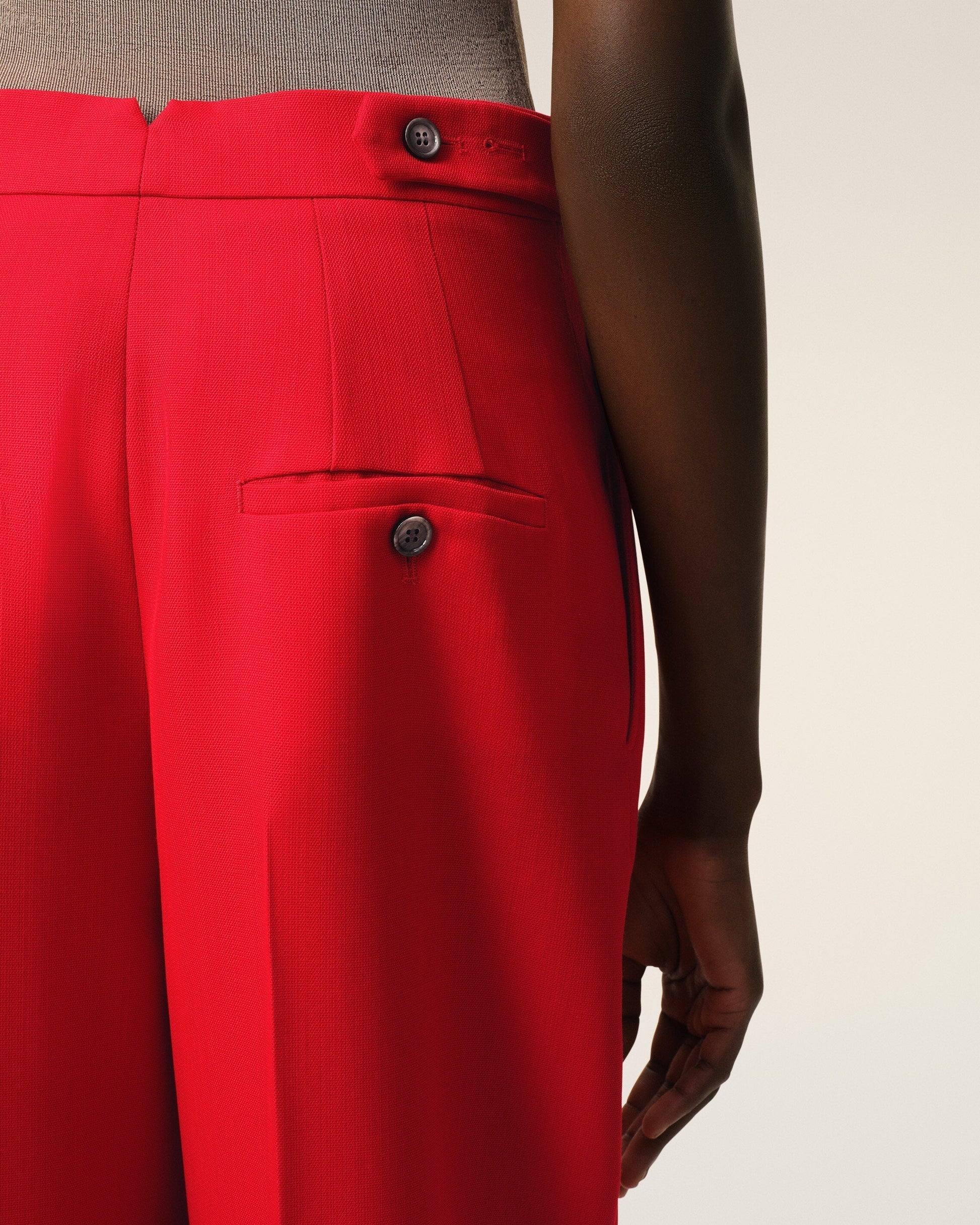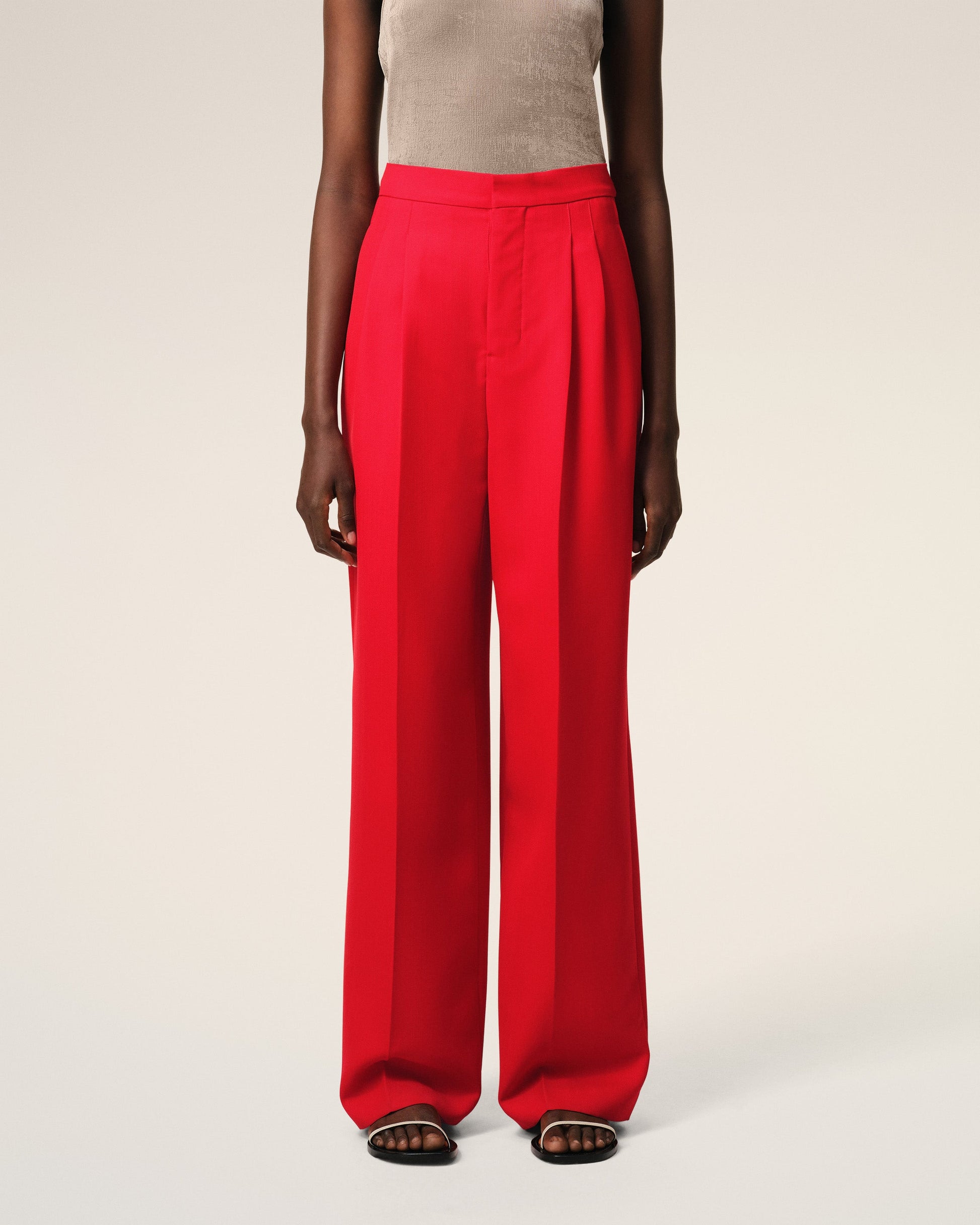 High waist large trousers in fluid wool canvas. Wide fit 30 cm bottom leg width (size 36) High waist Front lining to knees Front pleats Buttoned fly "ami" waistband V detail on the back Buttoned back pockets Buttoned adjustable tabs on side Horn buttons Made in Romania (with love) REF: FTR428.WV0068.632