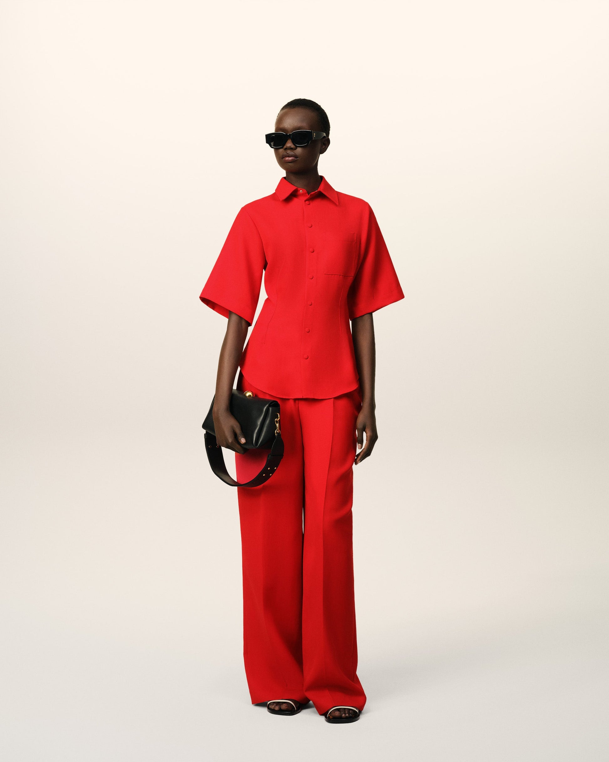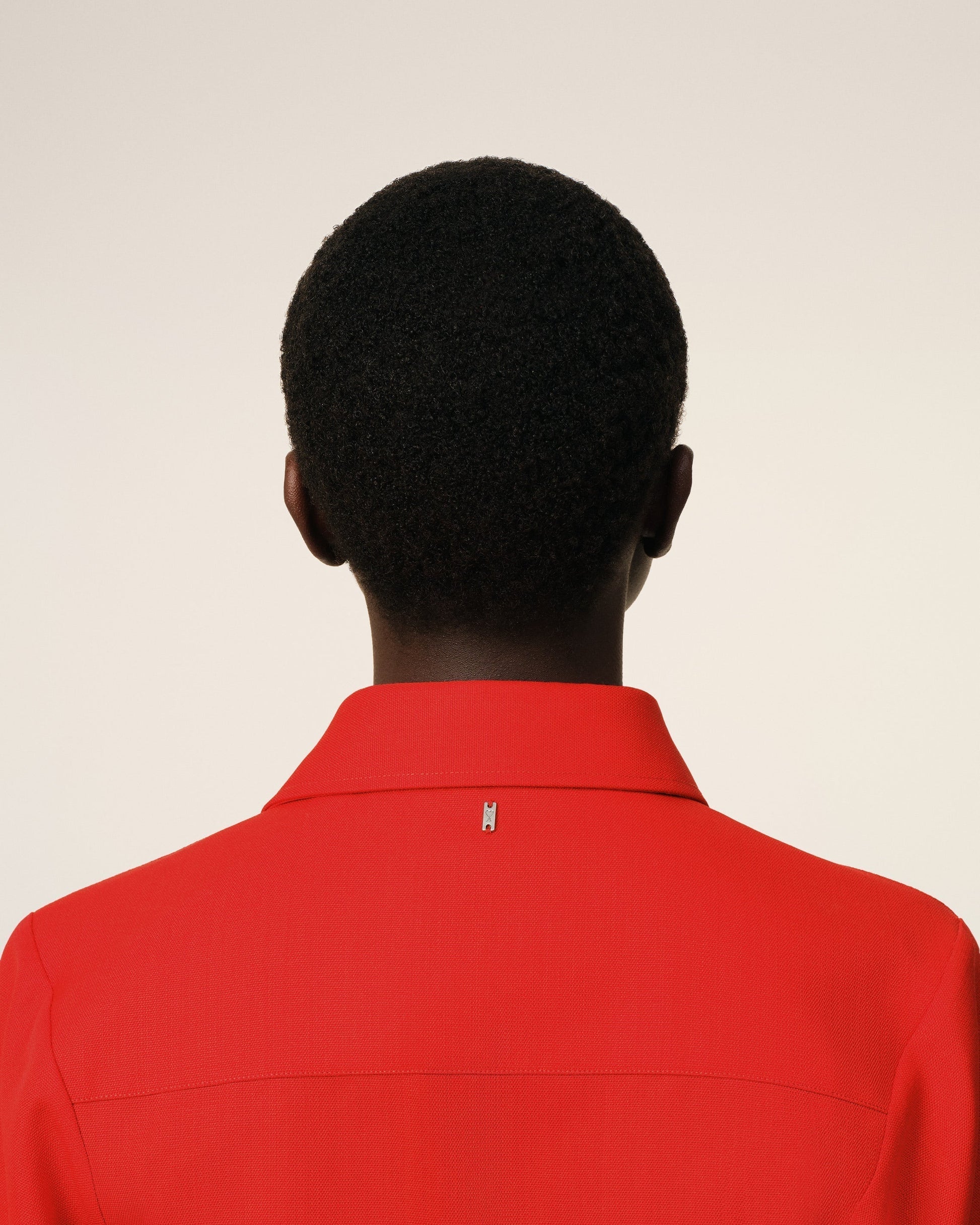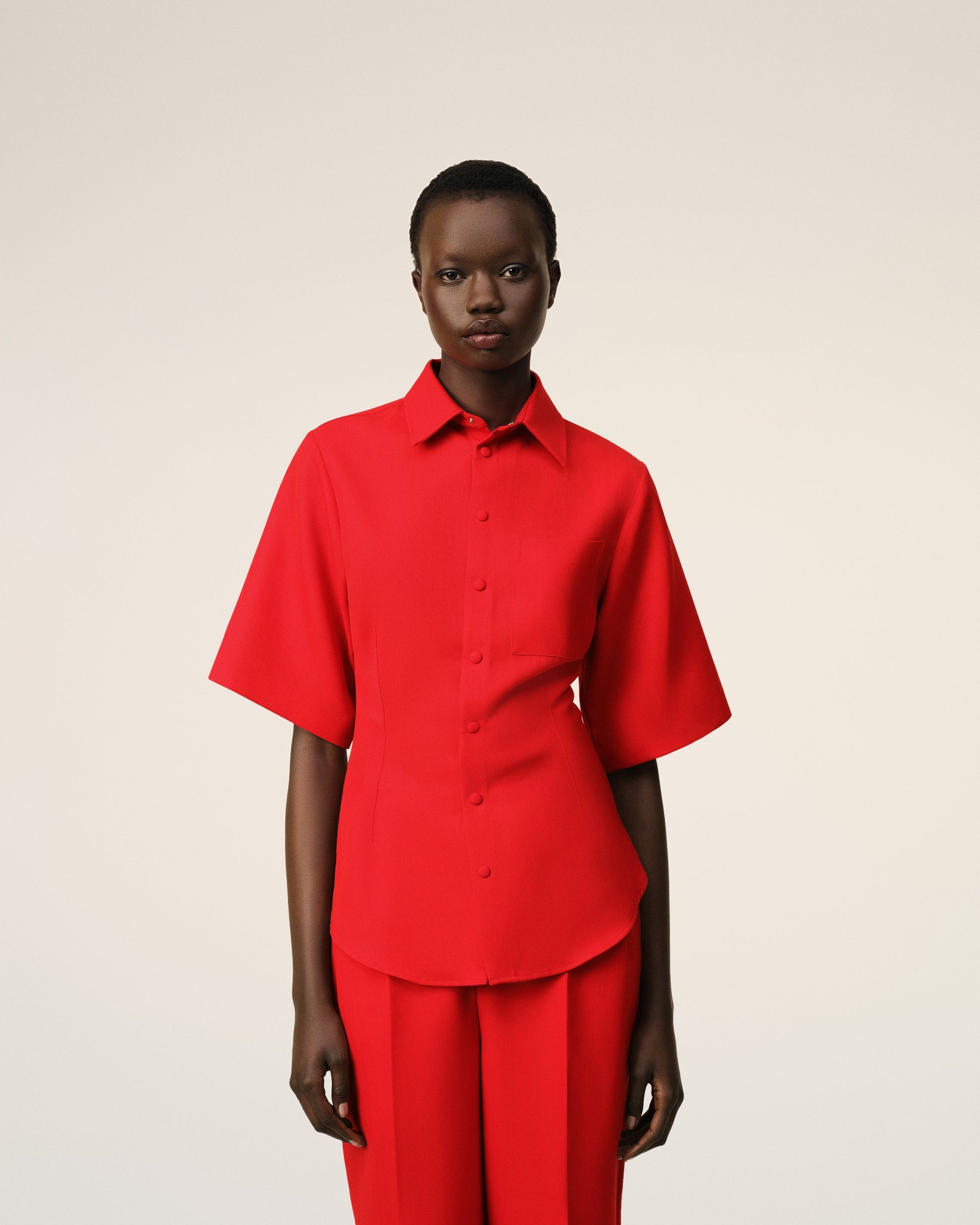 Short sleeves shirt in fluid wool canvas. Fitted fit 68 cm center back length (size 36) Chest patch pocket Classic collar Mini Ami de Coeur engraved metal plate under collar Covered snaps buttons in fluid wool canvas Made in Poland (with love) REF : FSH462.WV0068.632
