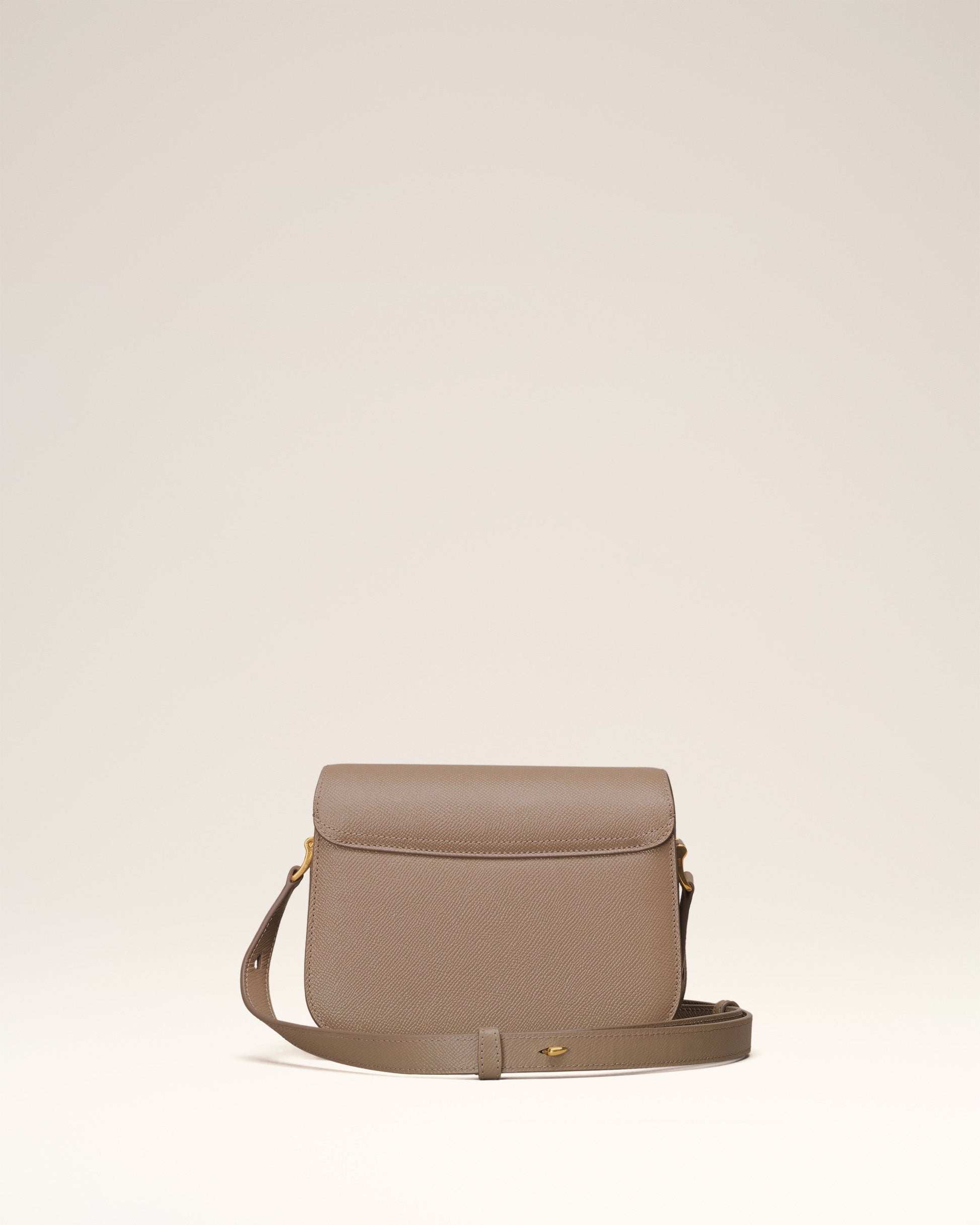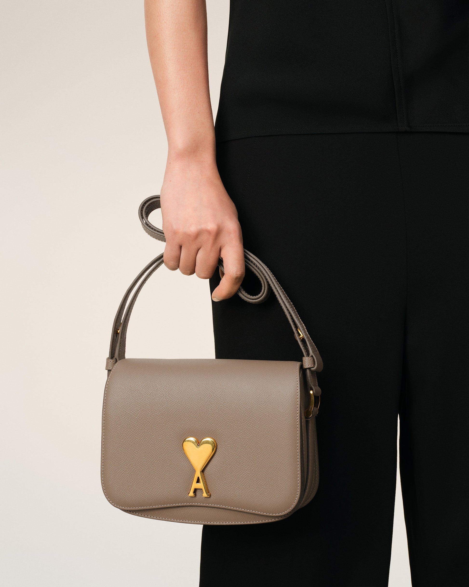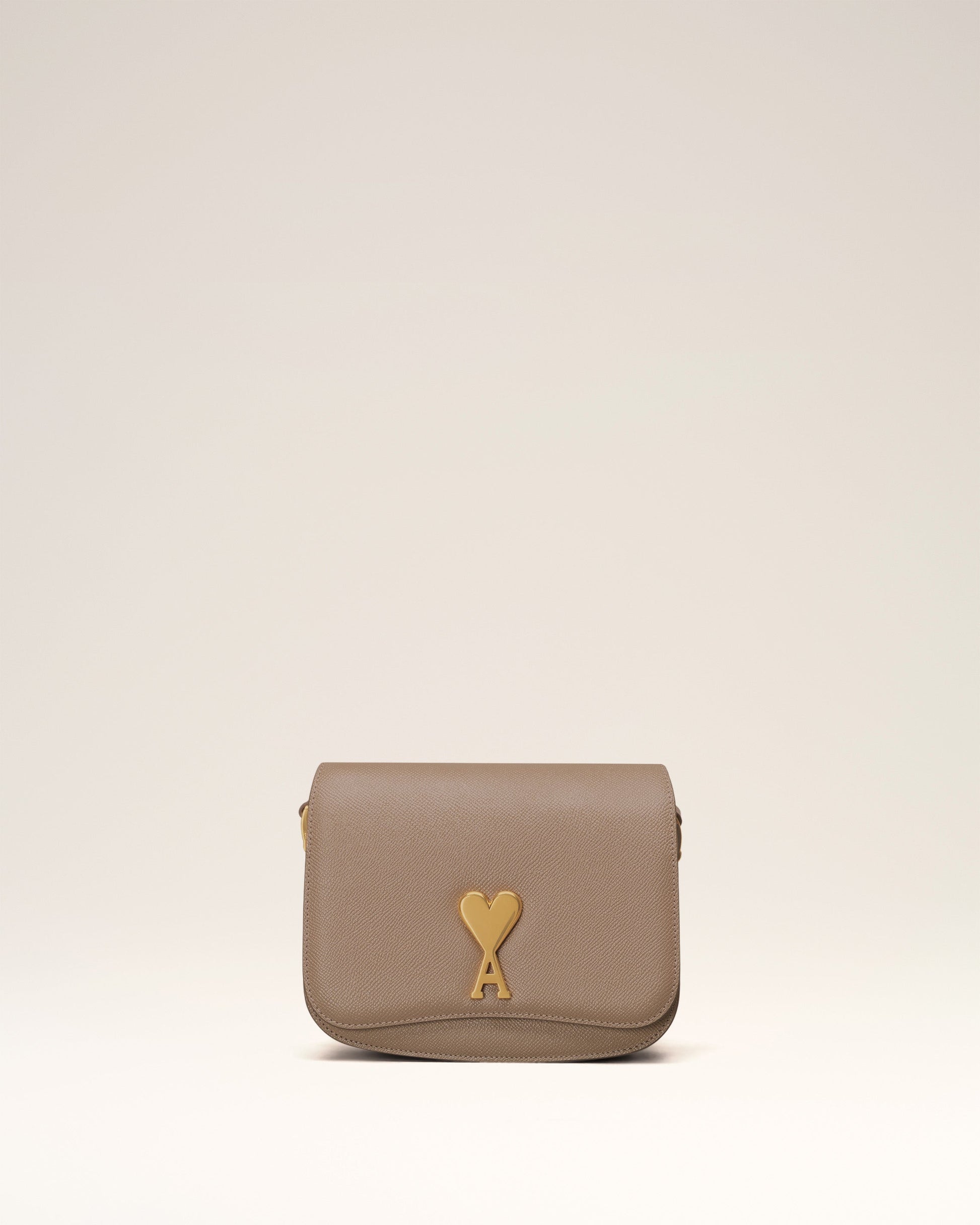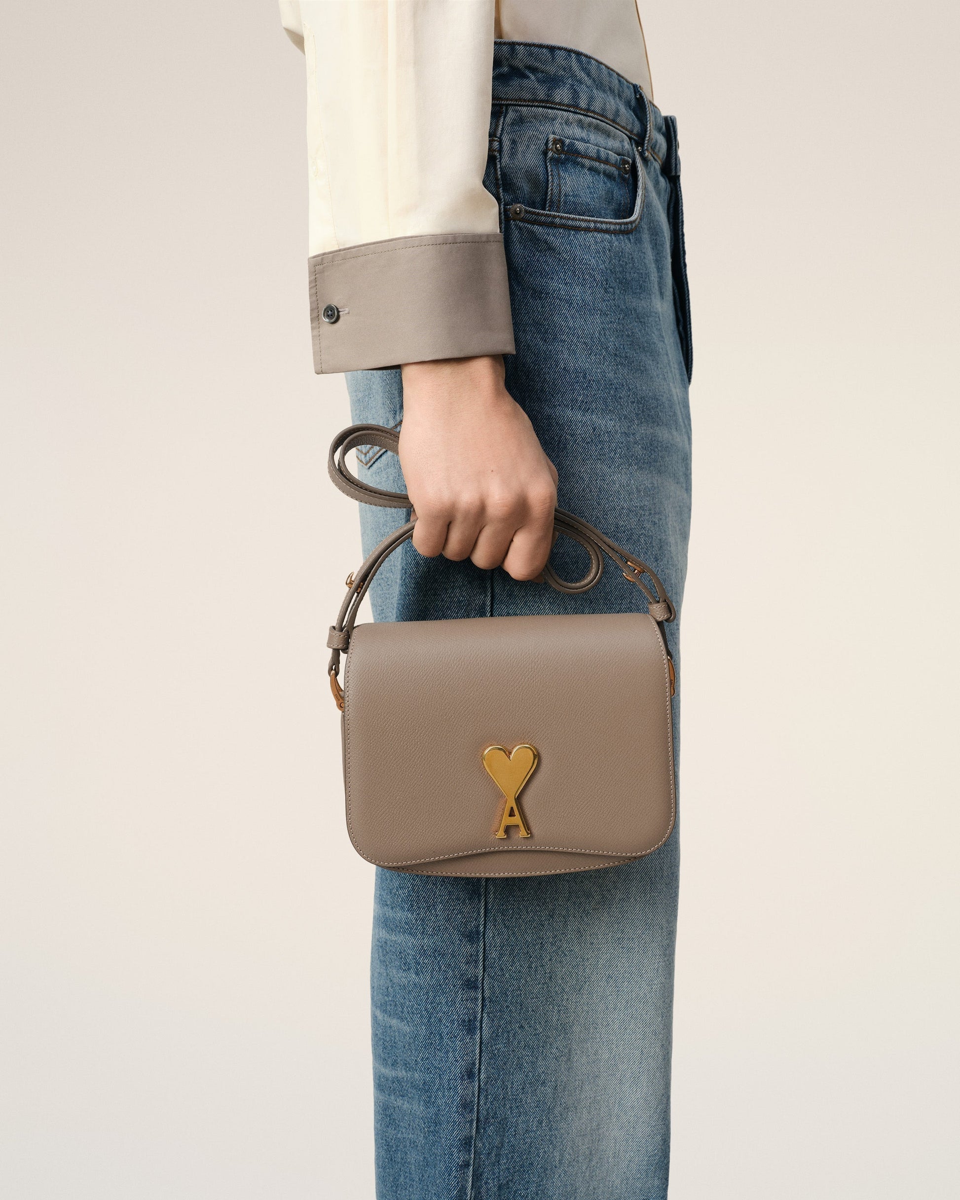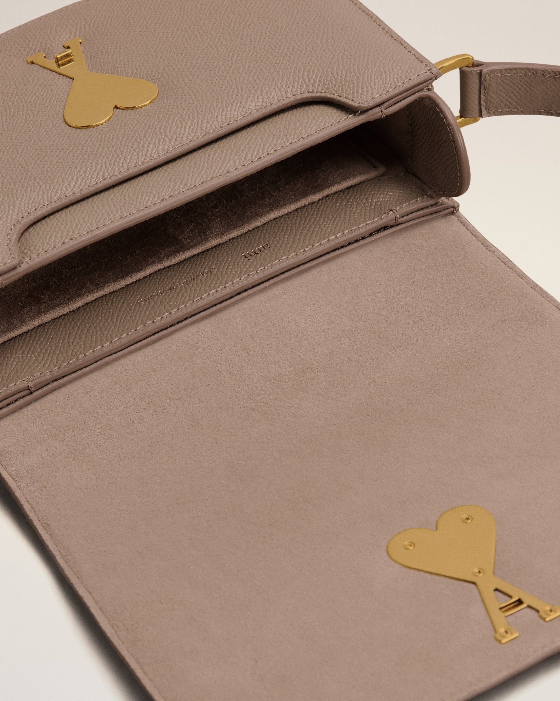 Paris Paris Small Bag in grained leather. Suede lambskin lining Ami de Coeur clasp One central compartment with a patched pocket and one front compartment Adjustable leather strap, crossbody or shoulder carry Metal hardware in vibrated brass color Size: 20x15x4.5 cm Made in Morocco (with love) REF : ULL005.AL0036.2811