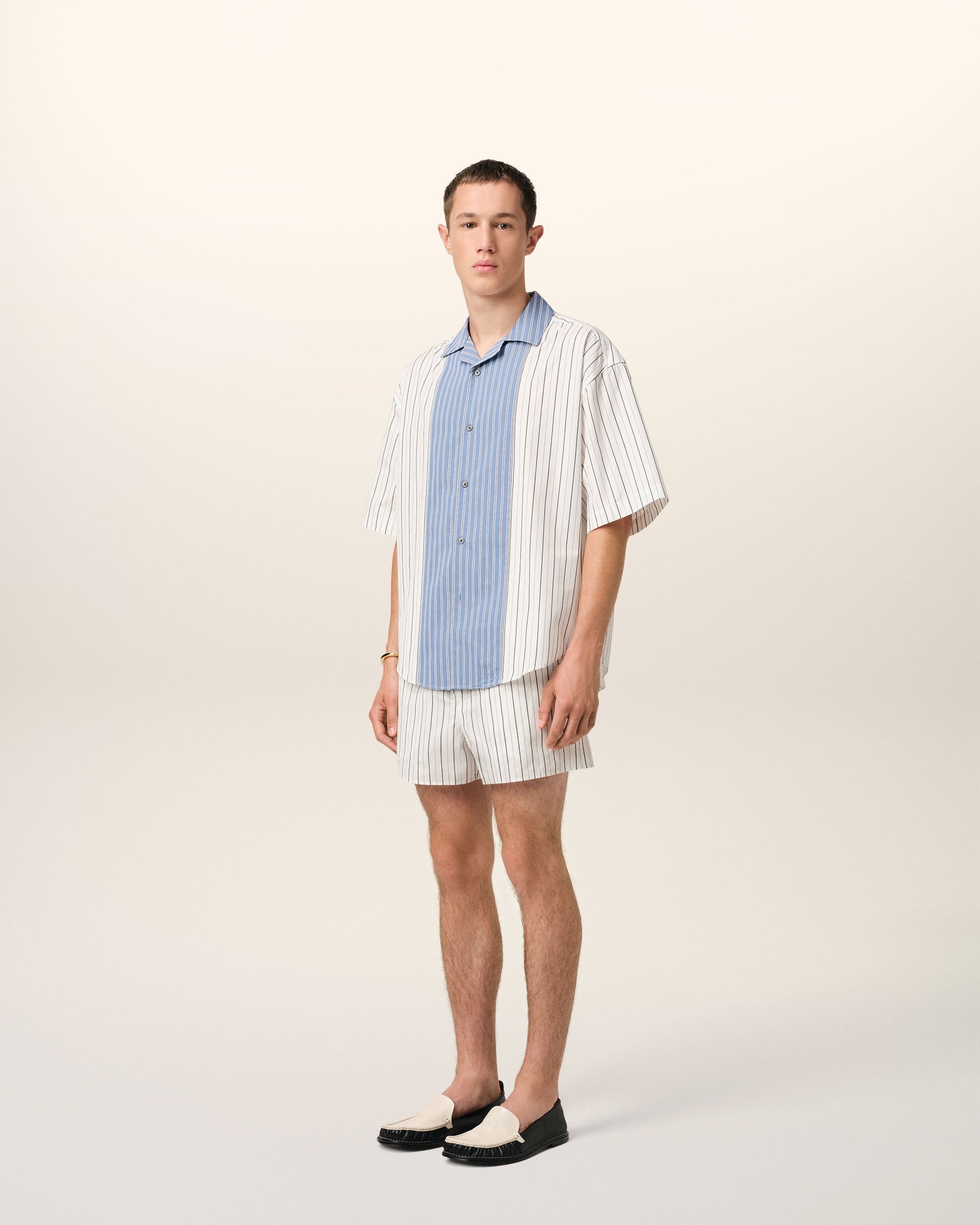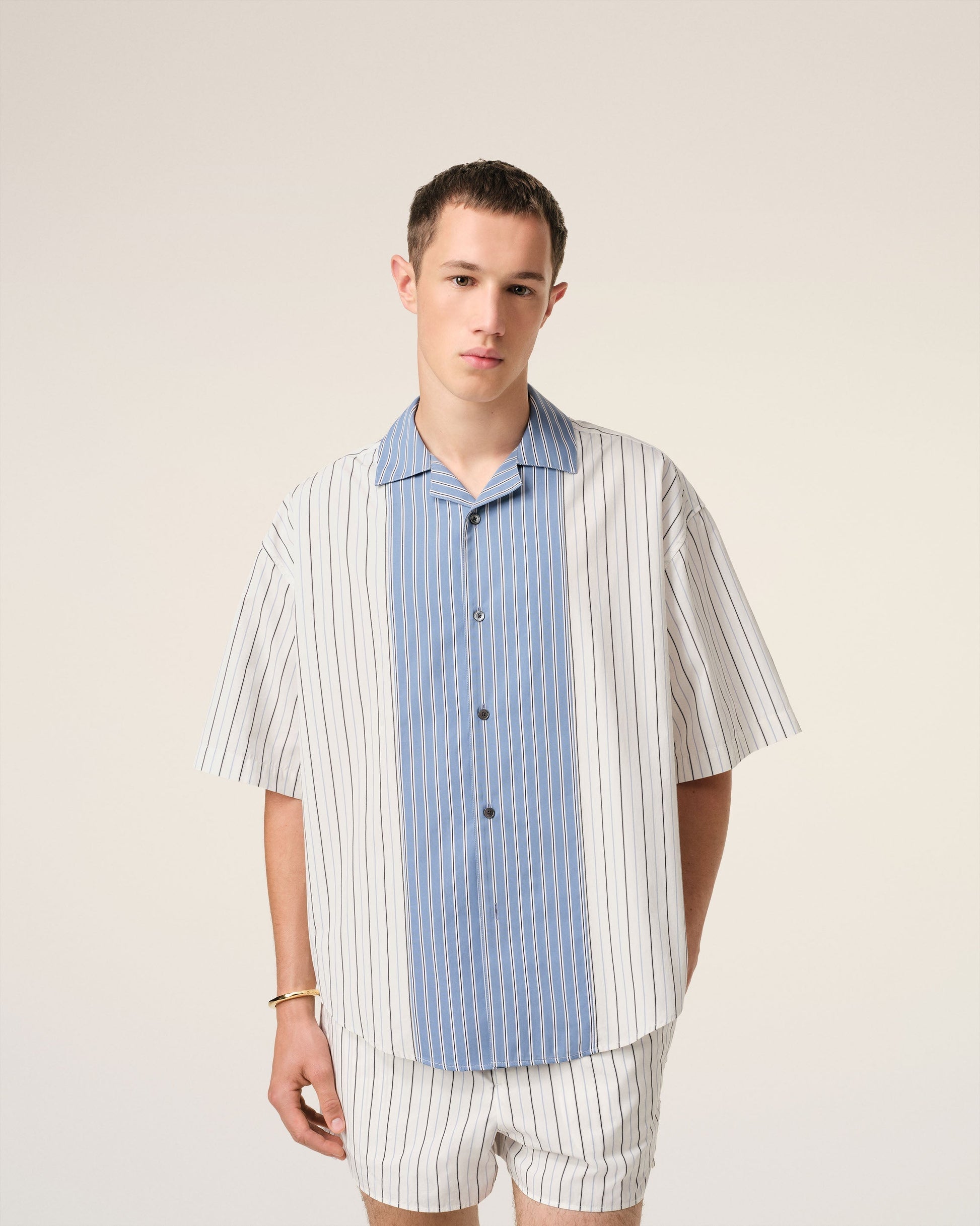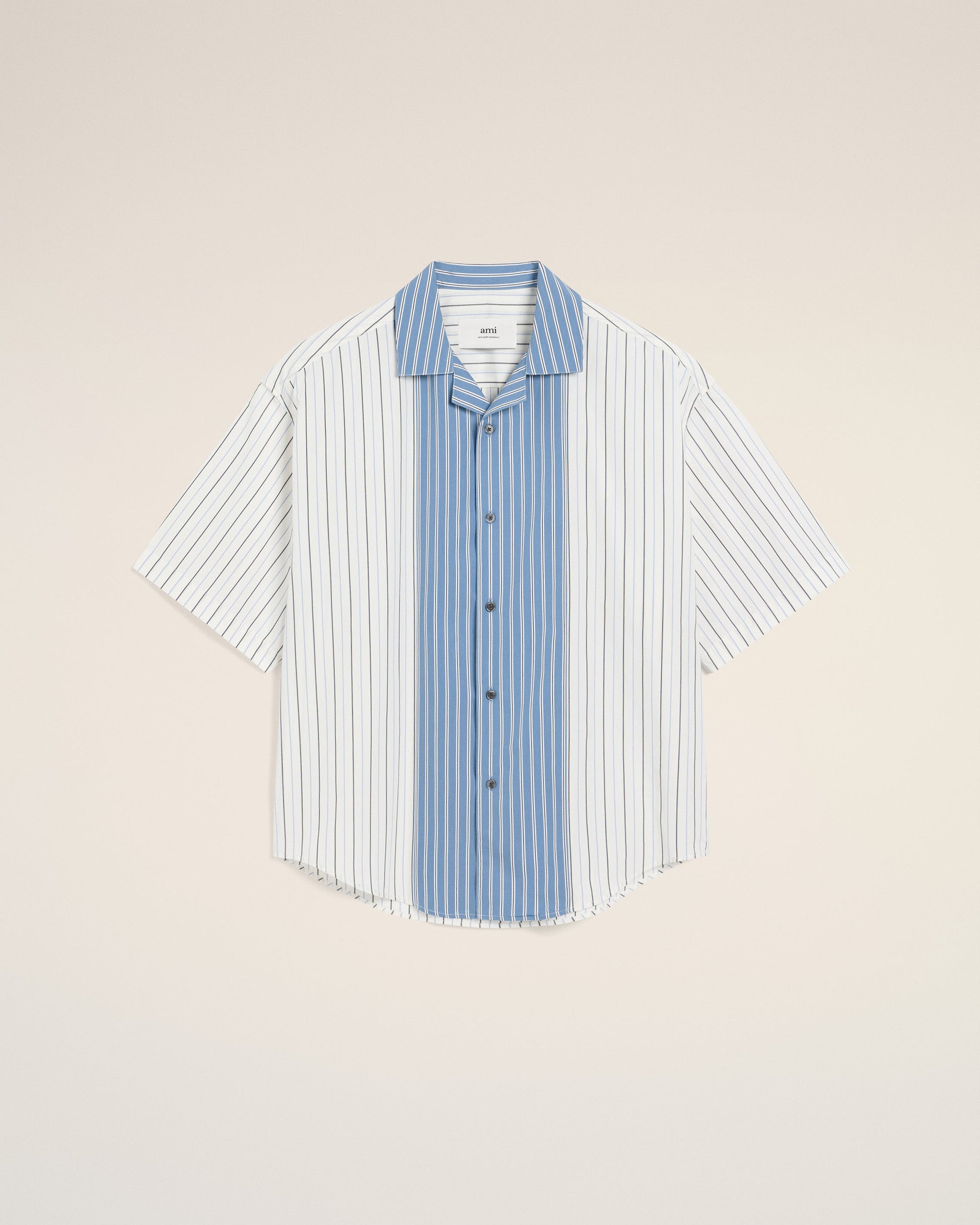 Short sleeve camp collar shirt in striped cotton poplin. Boxy fit 76 cm center back length (size 40) Front buttoned tab Camp collar Label "AMI alexandre mattiussi" handstitched under collar Mix and match of stripes cotton poplin Mother-of-pearl buttons Made in Portugal (with love) REF: HSH286.CO0109.1892
