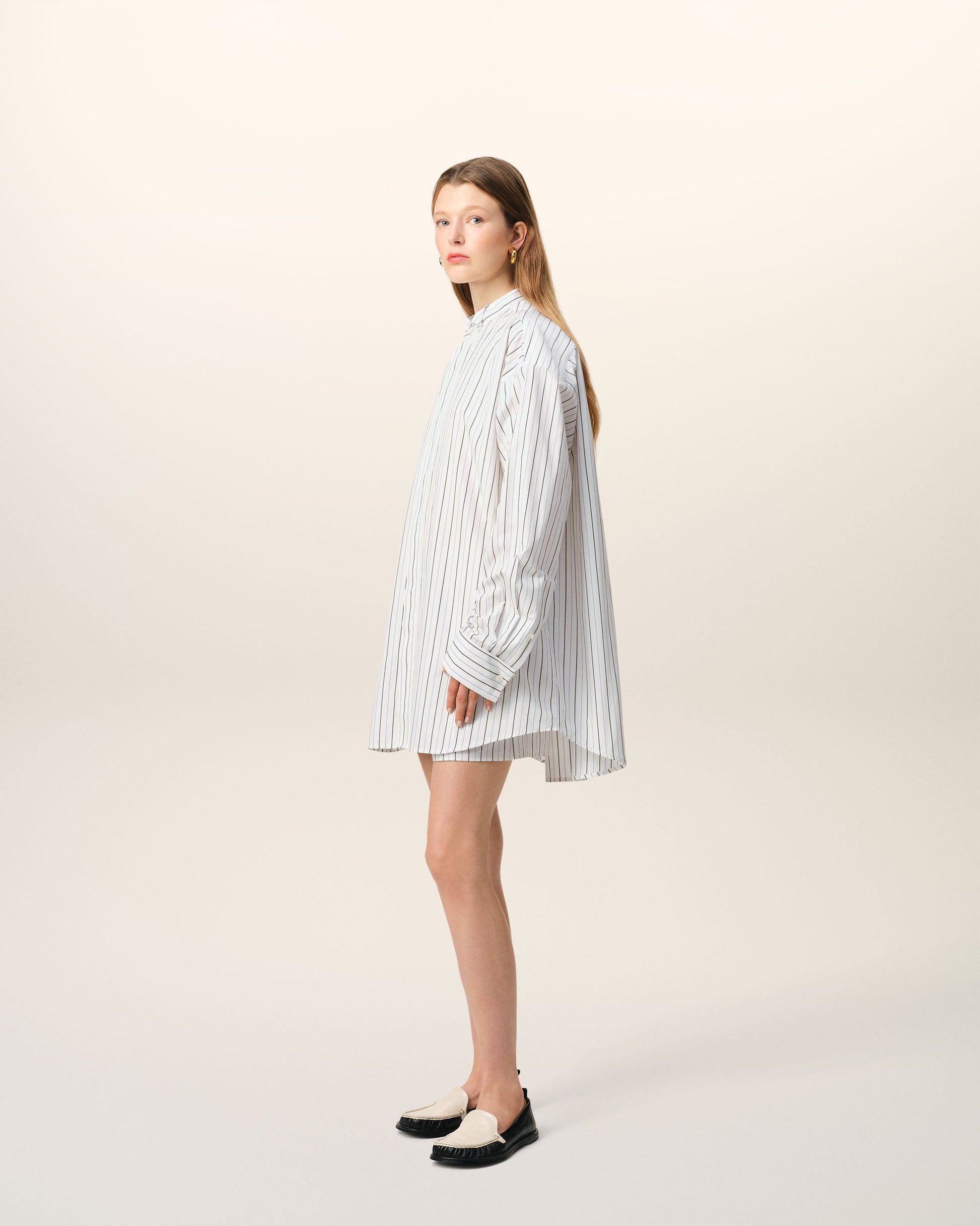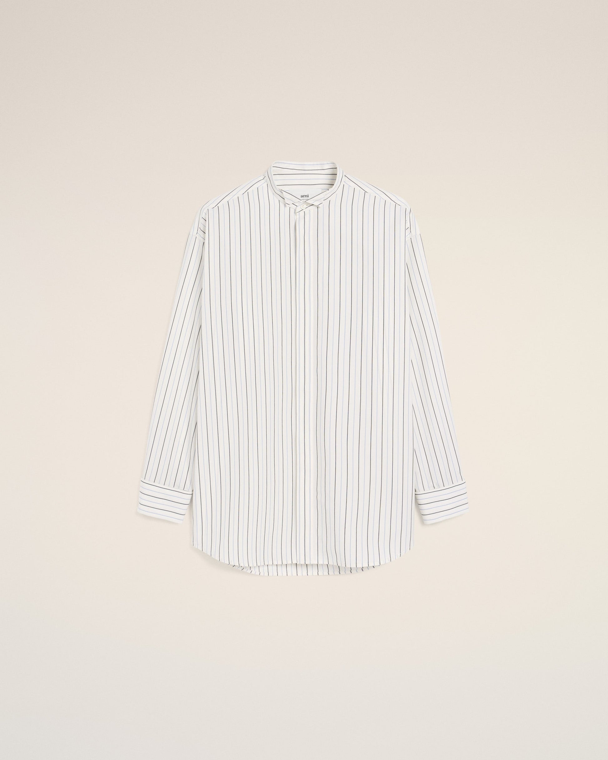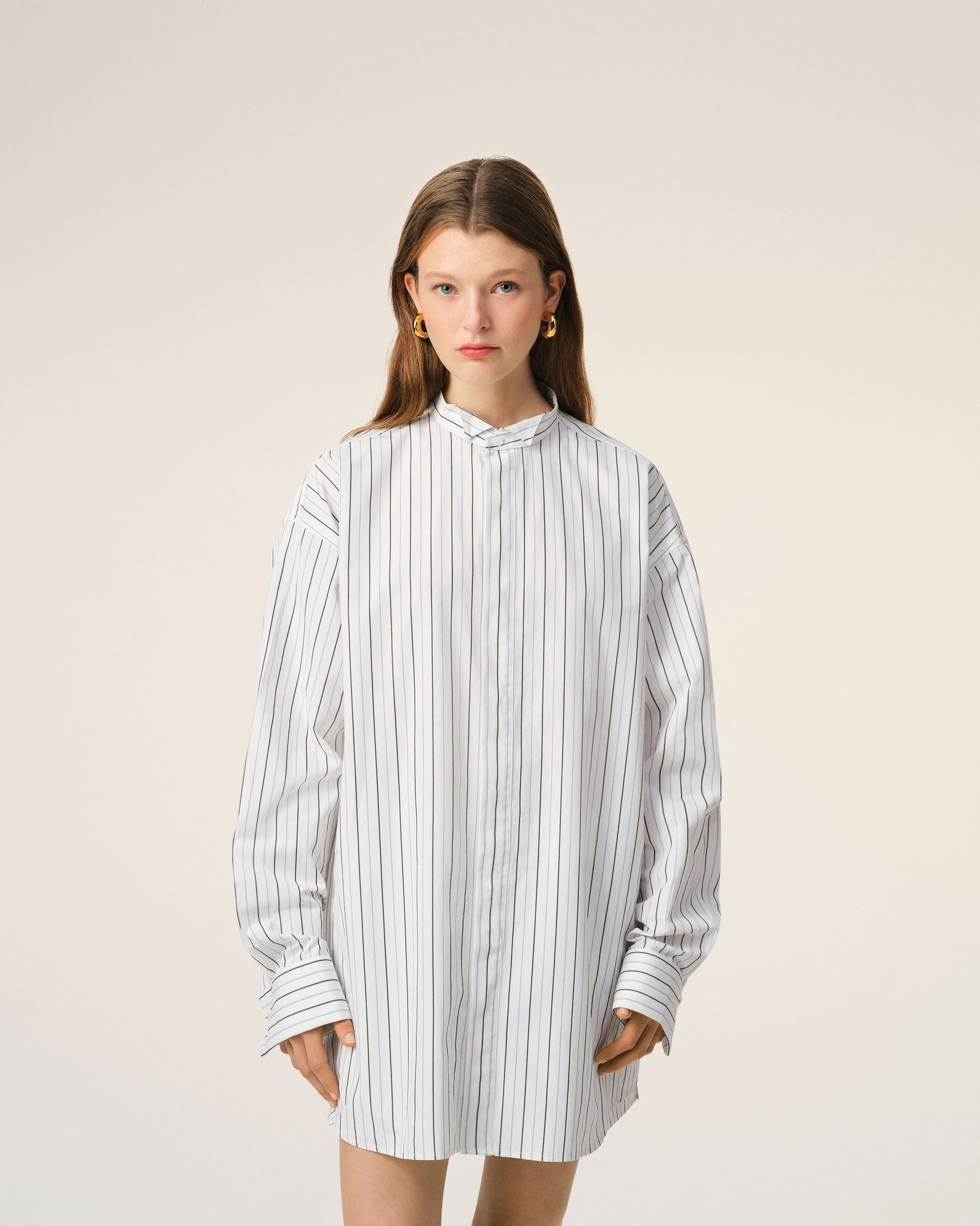 Wingtip collar shirt in cotton poplin double stripes. Oversized fit 88 cm center back length (size 36) Wingtip collar Hidden buttoned tab on front Cuffs and collar in horizontal stripes Buttonned cuffs Mother-of-pearl buttons Made in Bulgaria (with love) REF: FSH181.CO0109.1892