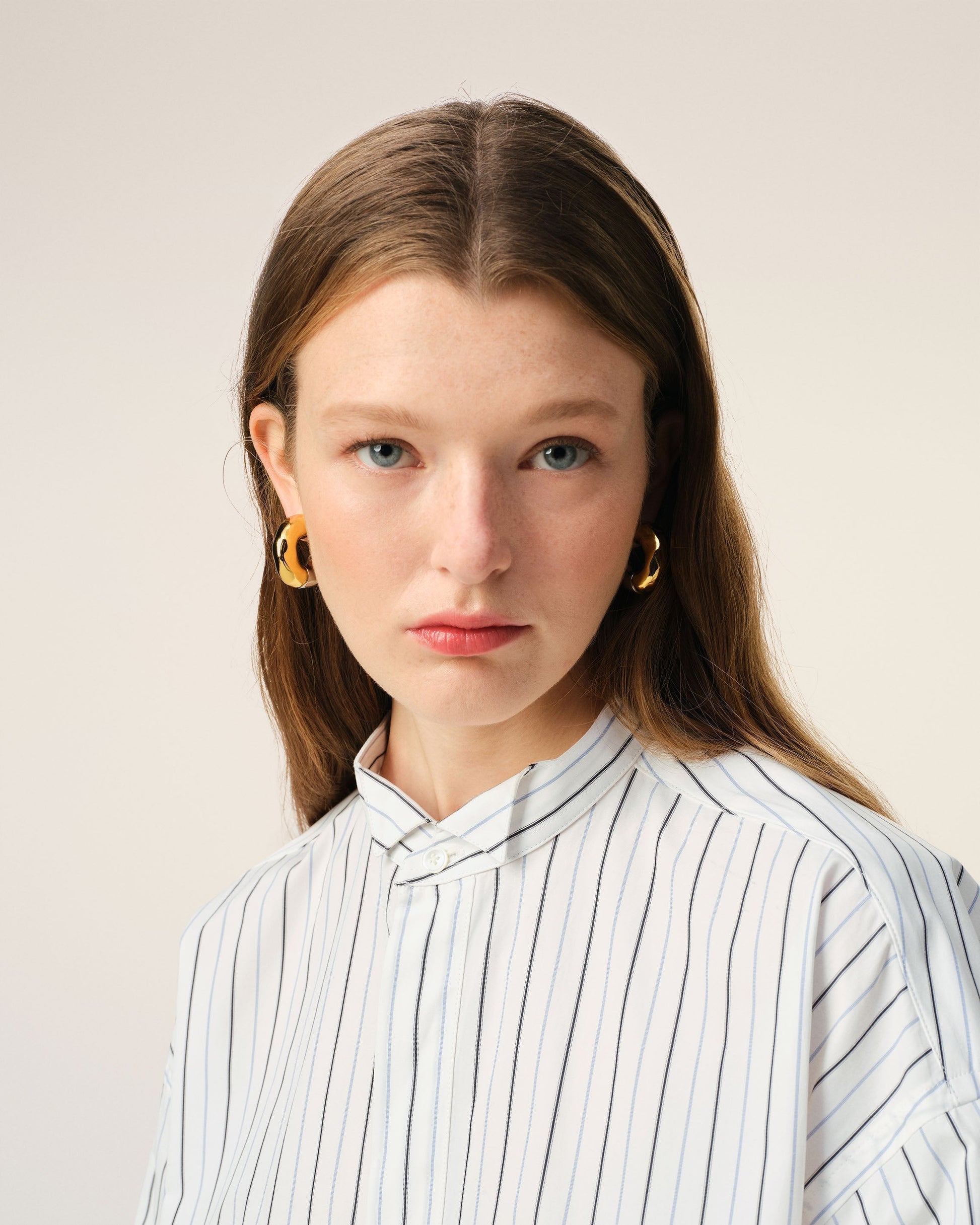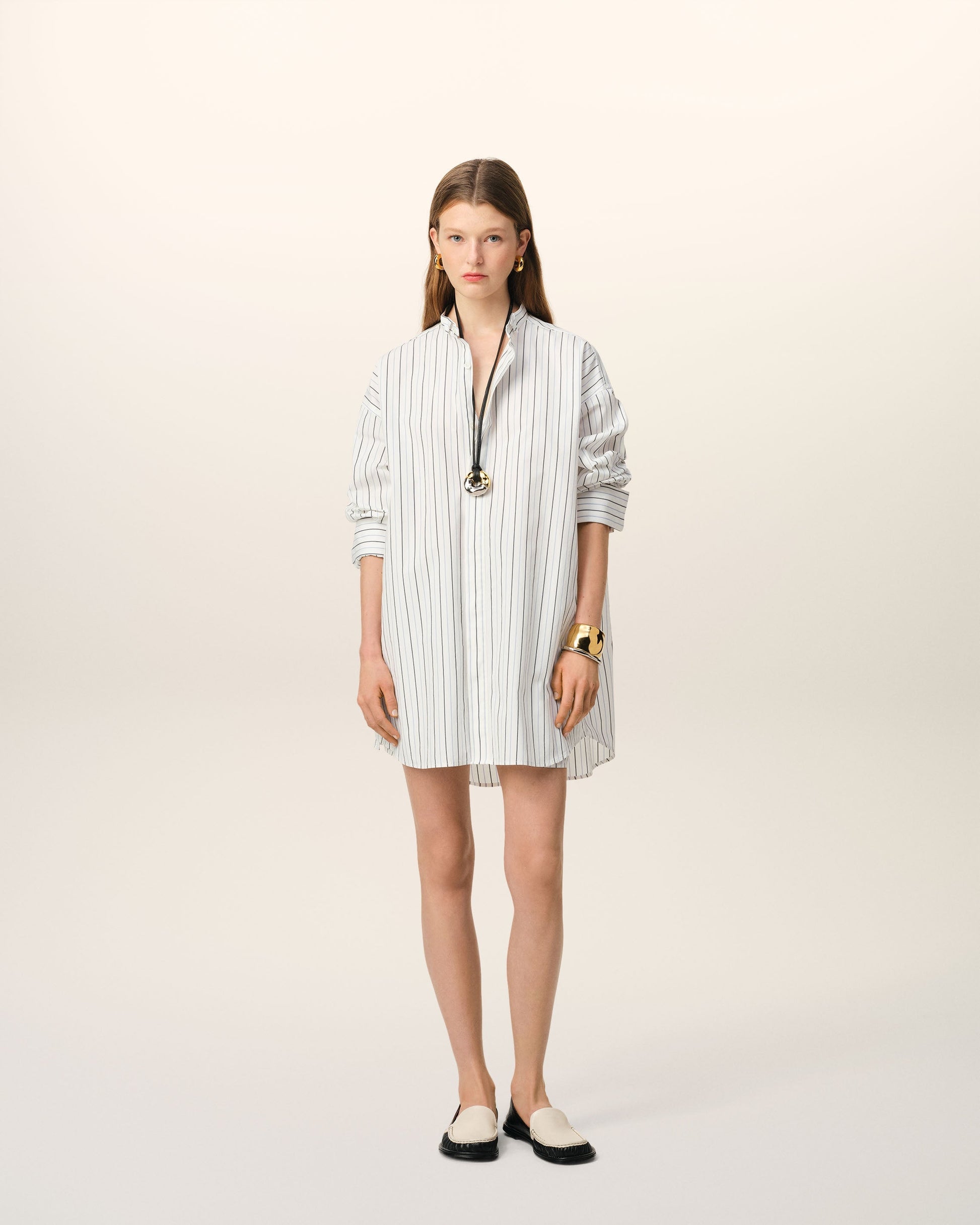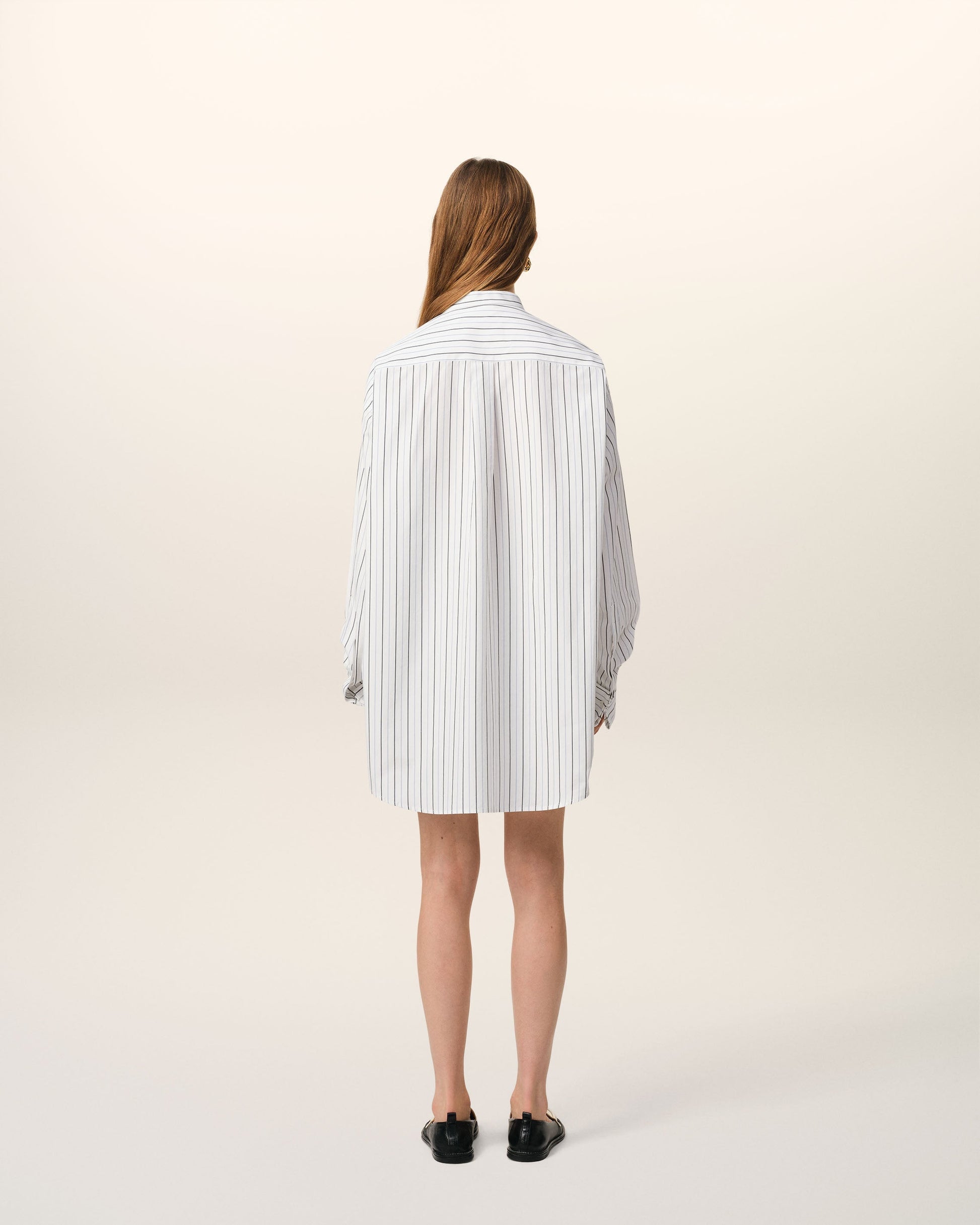 Wingtip collar shirt in cotton poplin double stripes. Oversized fit 88 cm center back length (size 36) Wingtip collar Hidden buttoned tab on front Cuffs and collar in horizontal stripes Buttonned cuffs Mother-of-pearl buttons Made in Bulgaria (with love) REF: FSH181.CO0109.1892