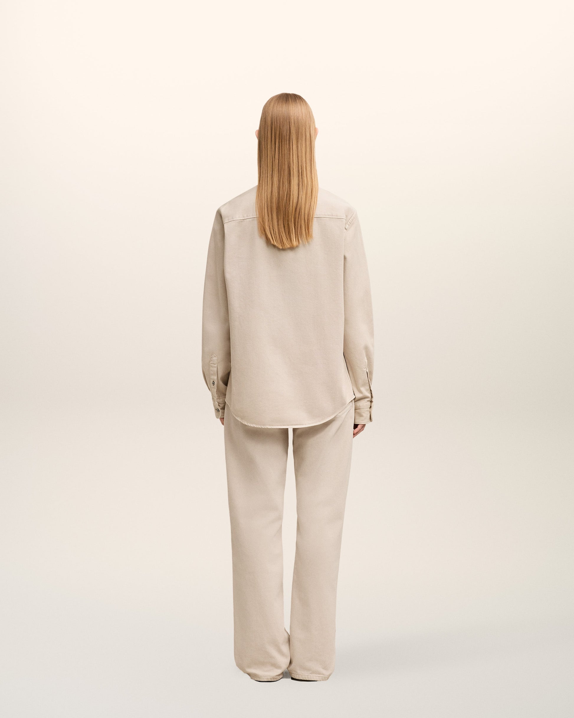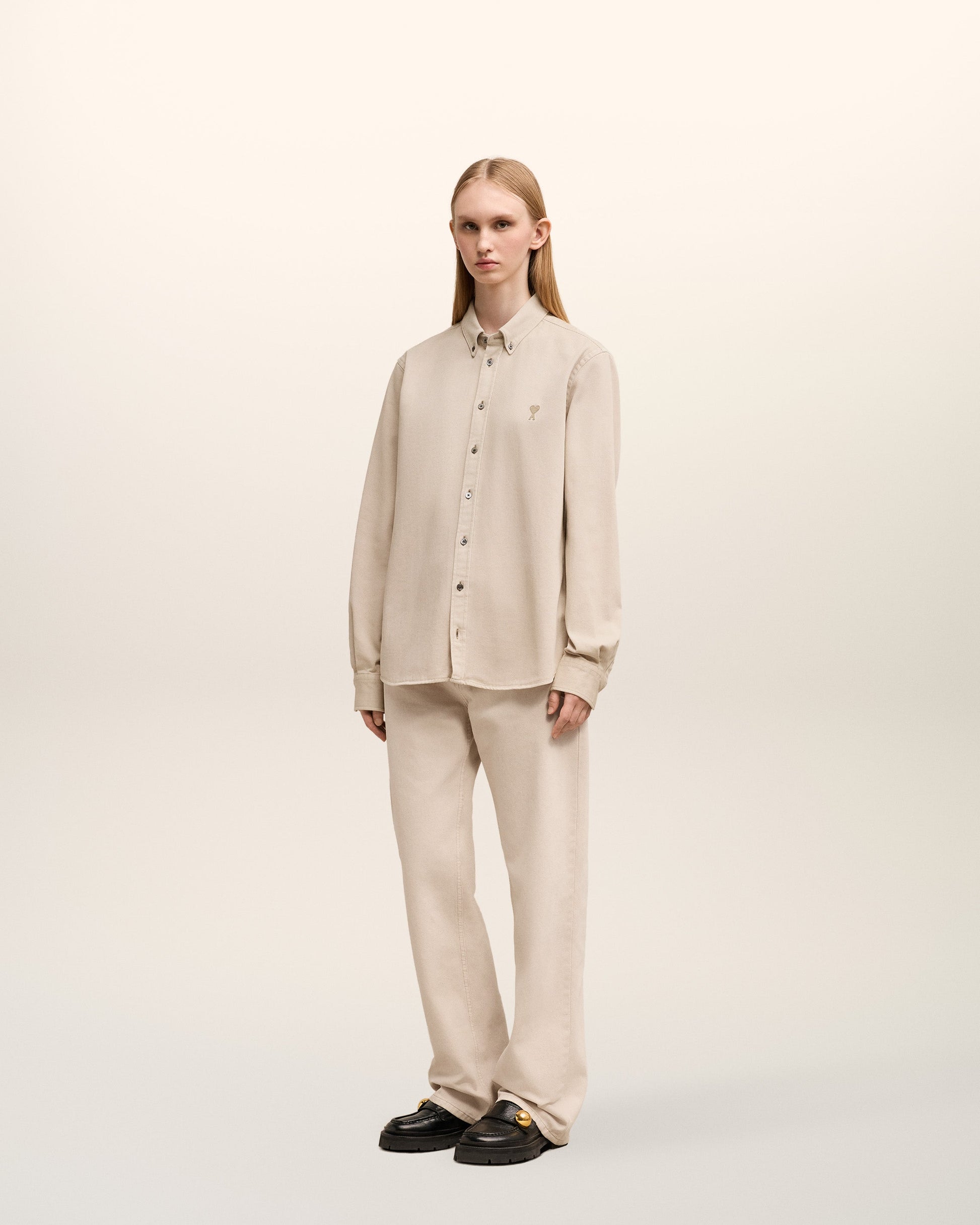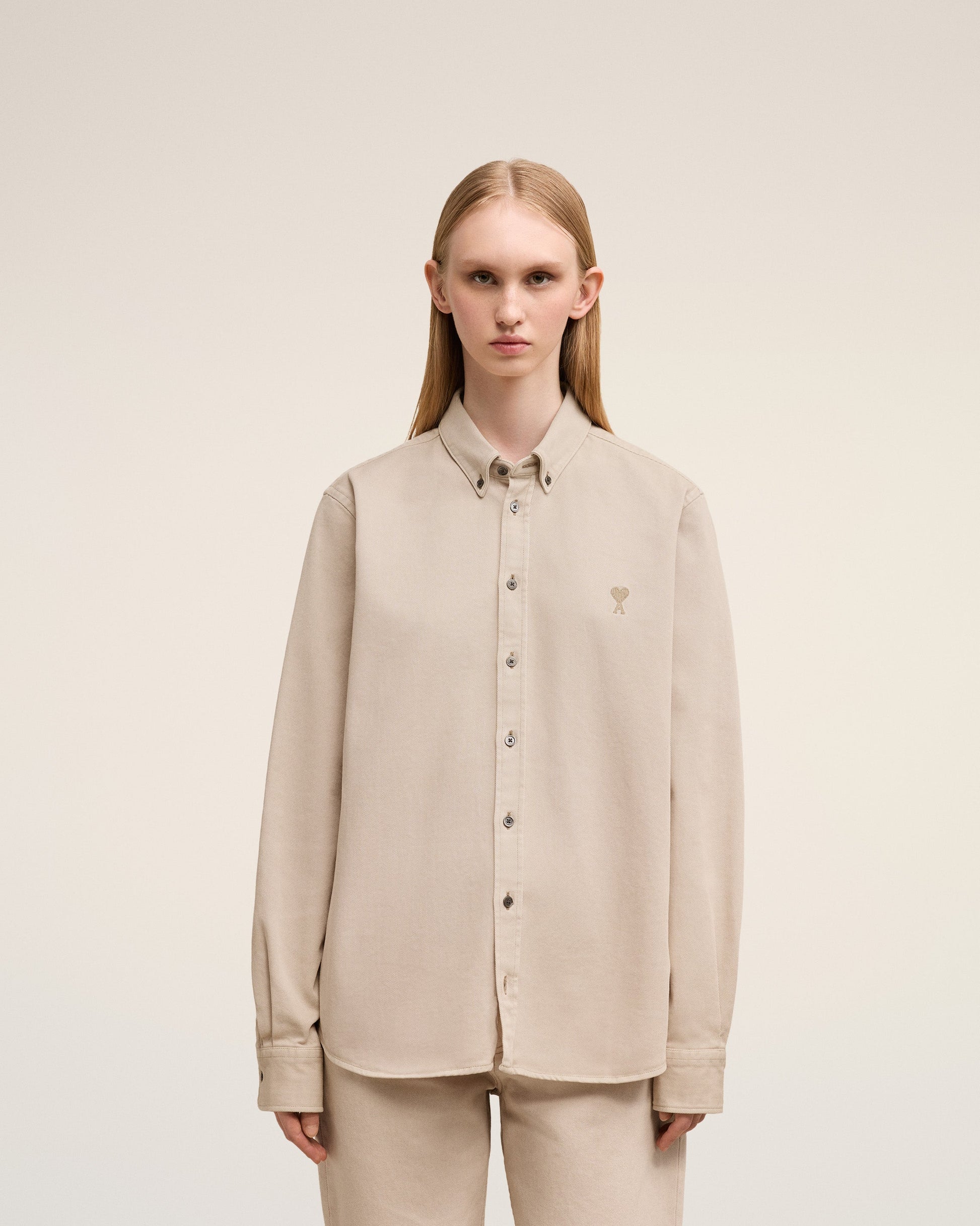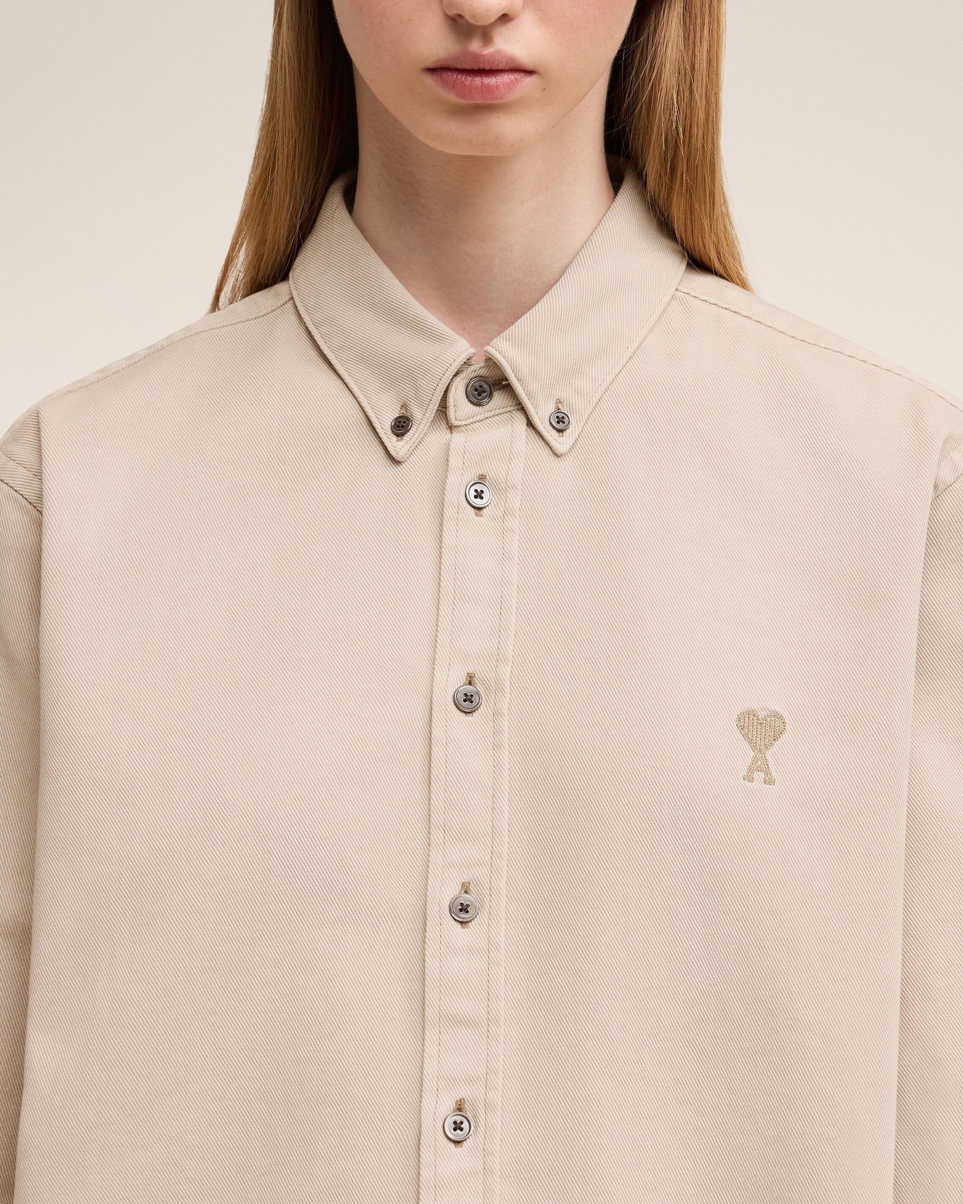 Ami de Coeur button-down shirt in light colored cotton twill. Classic fit Unisex product 75,5 cm center back length (size XS) 76 cm center back length (size M) Tonal Ami de Coeur chest embroidery Button-down collar Buttoned tab on front and cuffs Mother-of-pearl buttons Made in Portugal (with love) REF : USH060.CO0149.150