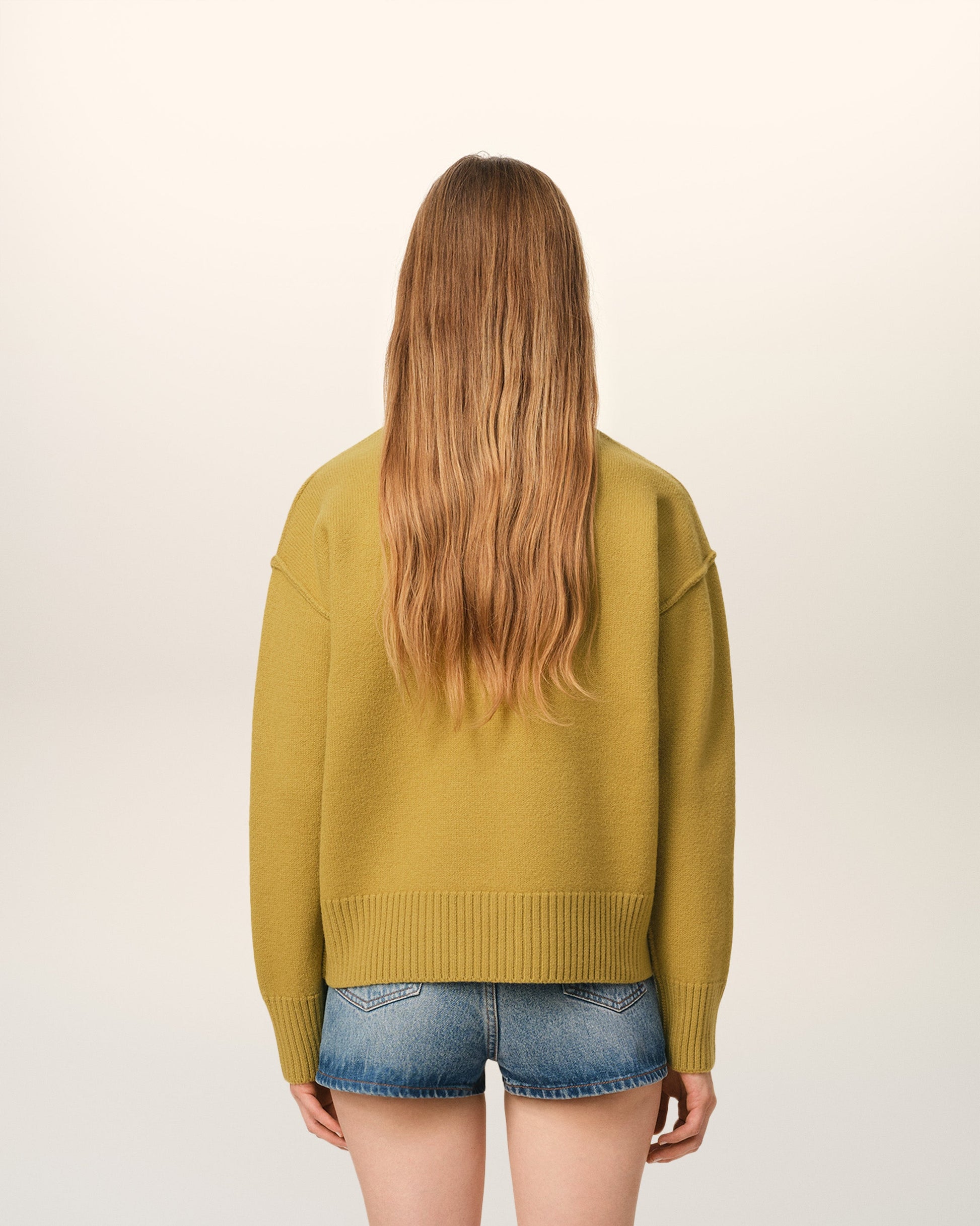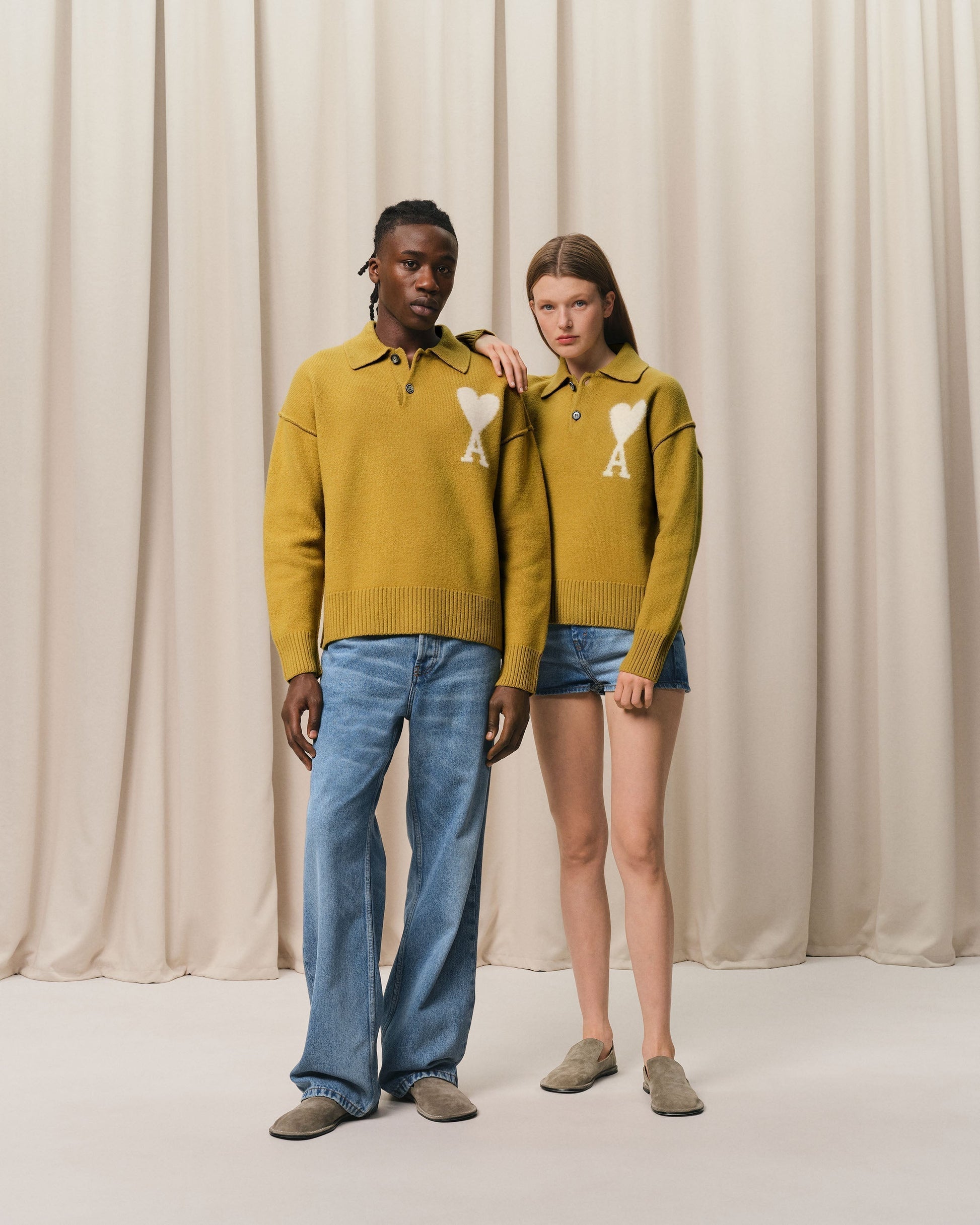 Polo in felted merino wool. Unisex product Jersey stitch Textured intarsia-knitted off white Ami de Coeur on the chest Inside out seams 64 cm center back length (size M) 58 cm center back length (size XS) Made in Portugal (with love) REF: UPL390.KN0090.2821