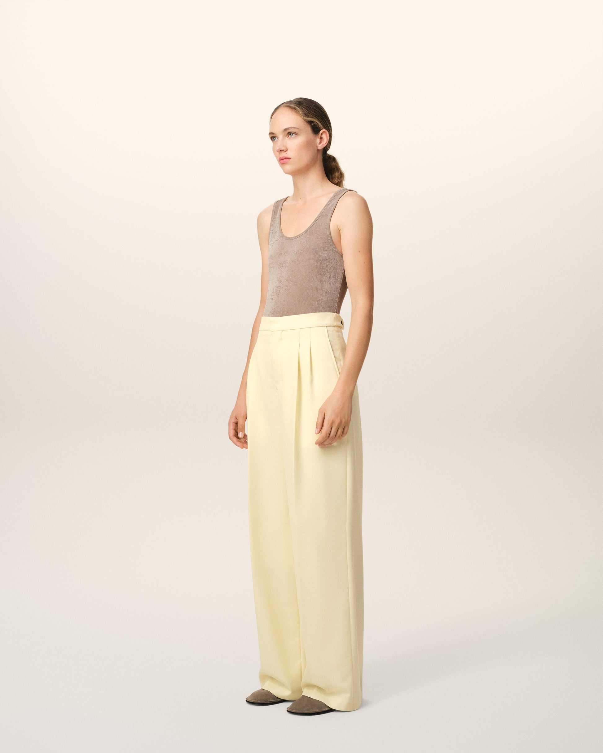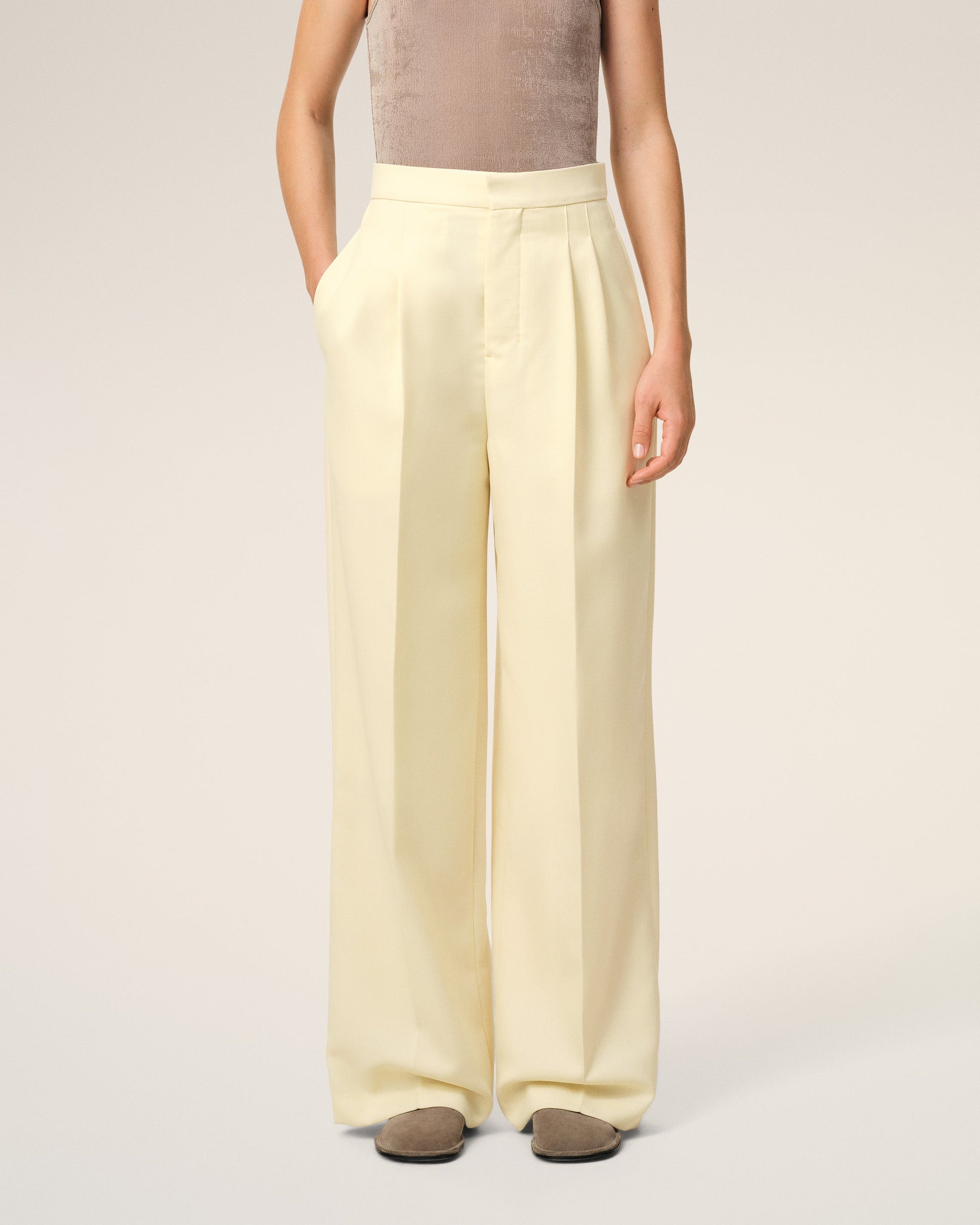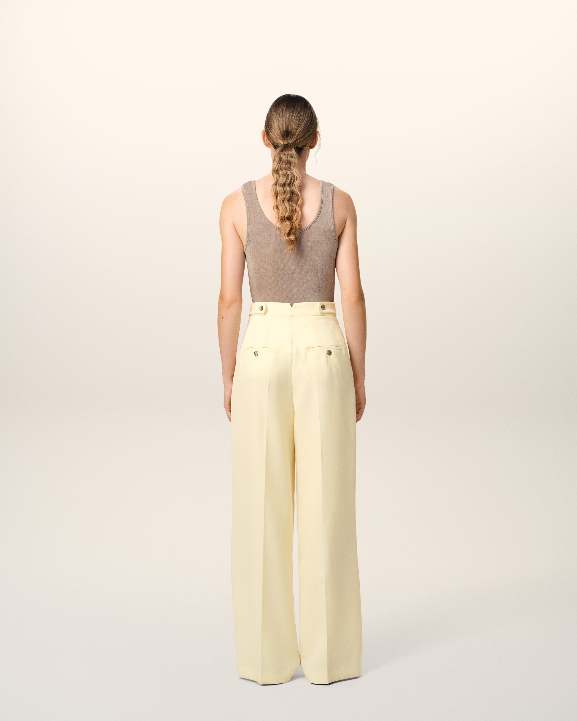 High waist large trousers in fluid wool canvas. Wide fit 30 cm bottom leg width (size 36) High waist Front lining to knees Front pleats Buttoned fly "ami" waistband V detail on the back Buttoned back pockets Buttoned adjustable tabs on side Horn buttons Made in Romania (with love) REF: FTR428.WV0068.726
