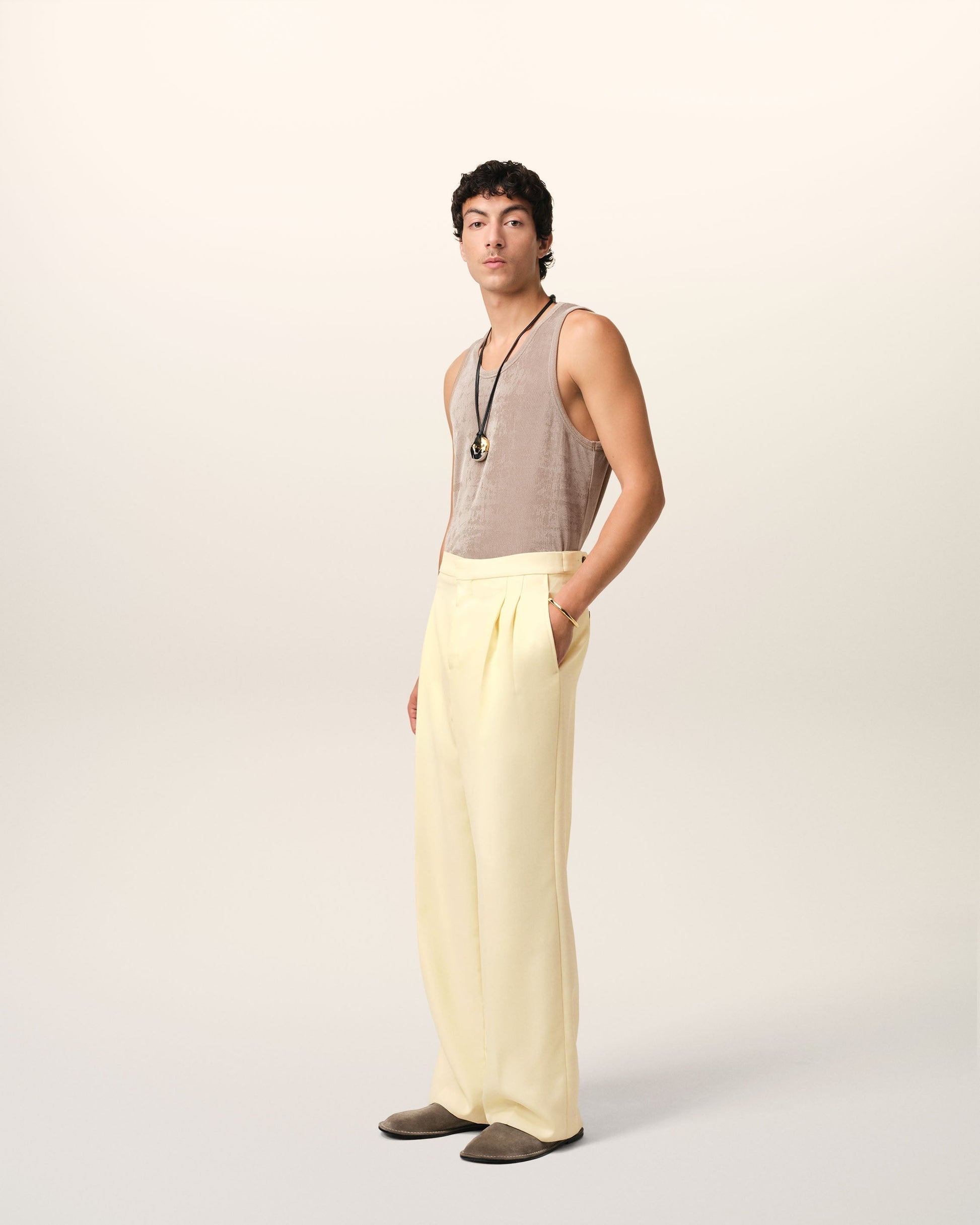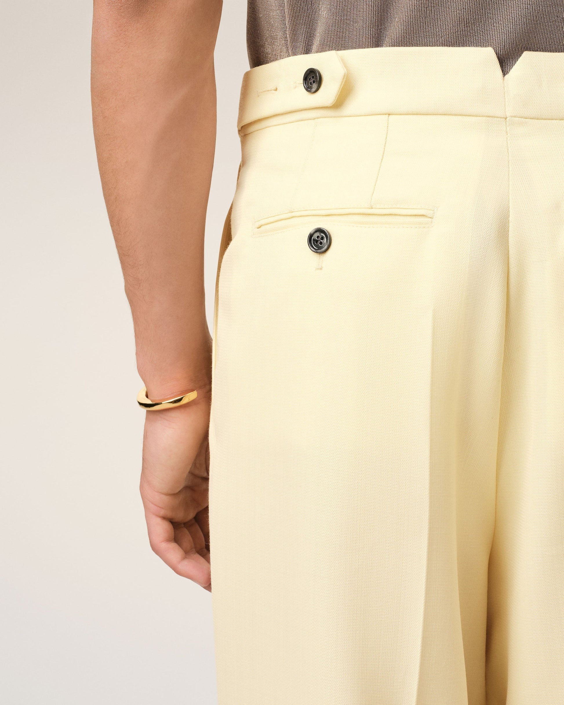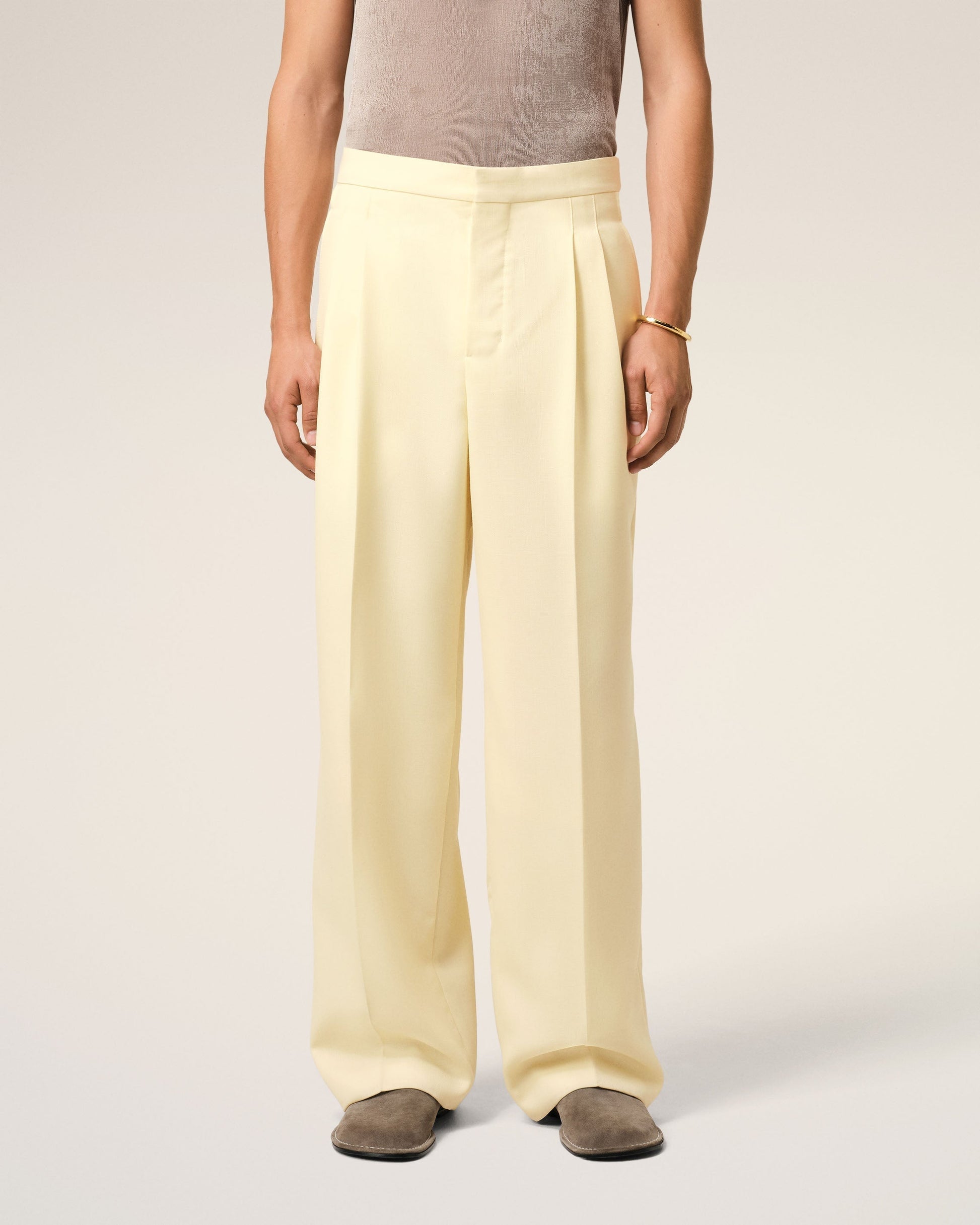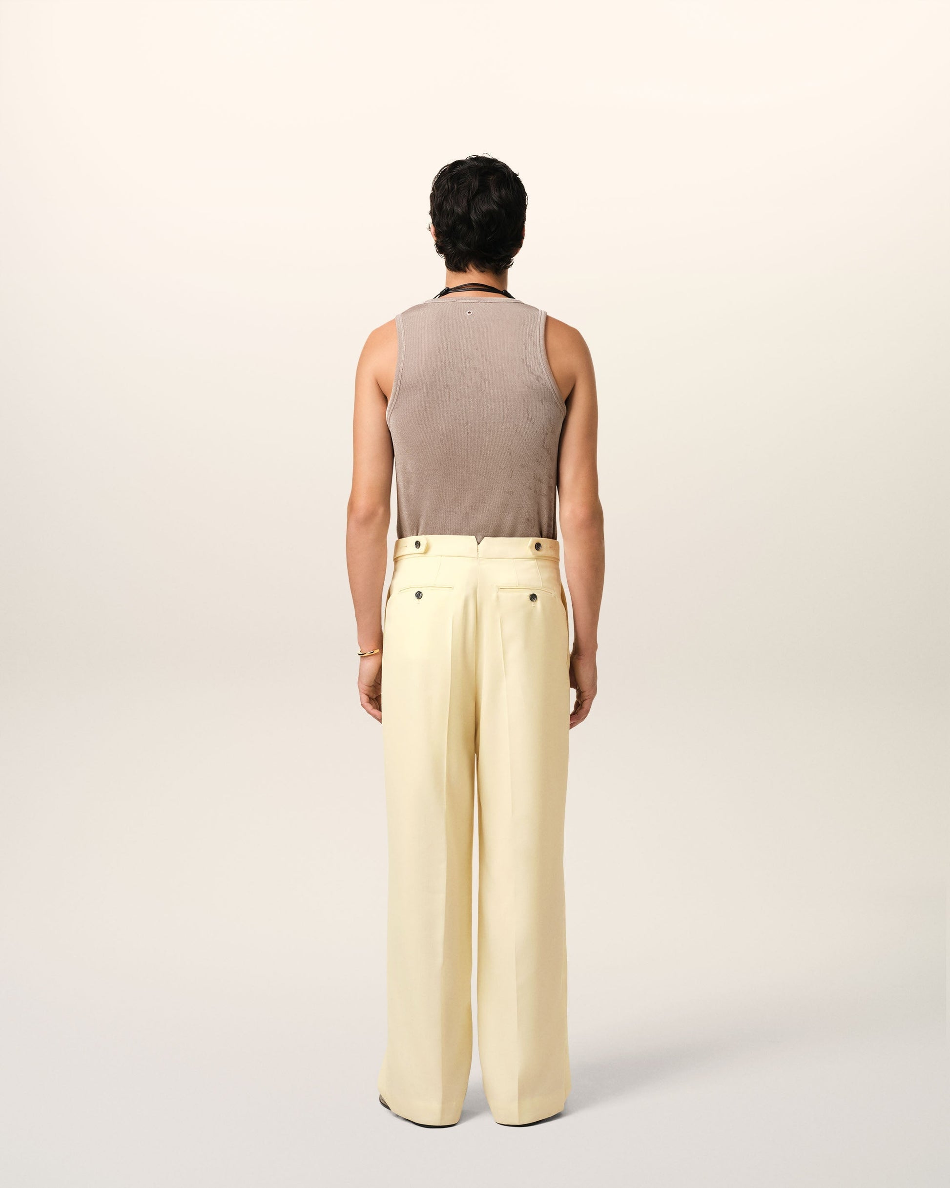Large fit trousers in light wool canvas. Wide fit 28 cm bottom leg width (size 40) Front lining to knees Front pleats Buttoned fly "ami" waistband V detail on the back Buttoned back pockets Buttoned adjustable tabs on side Horn buttons Made in Romania (with love) REF: HTR429.WV0068.726