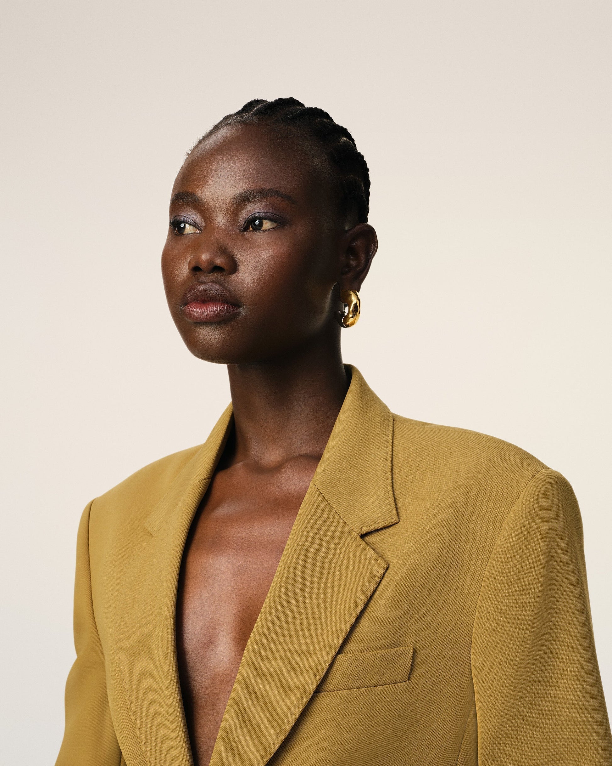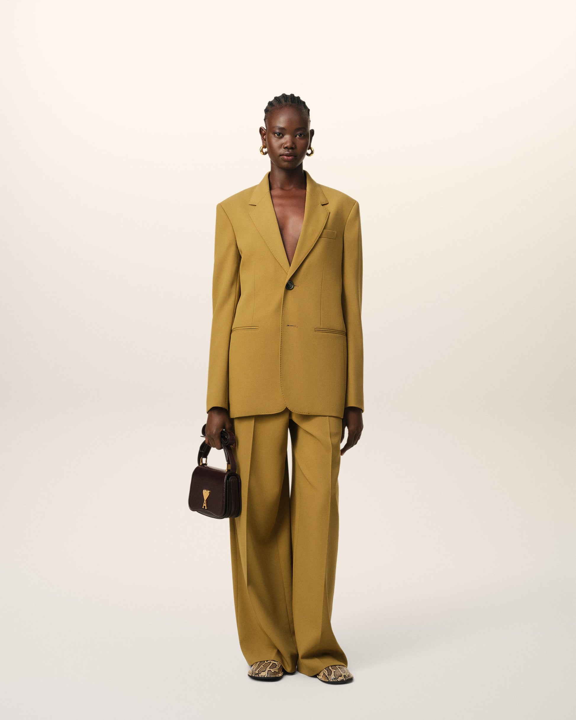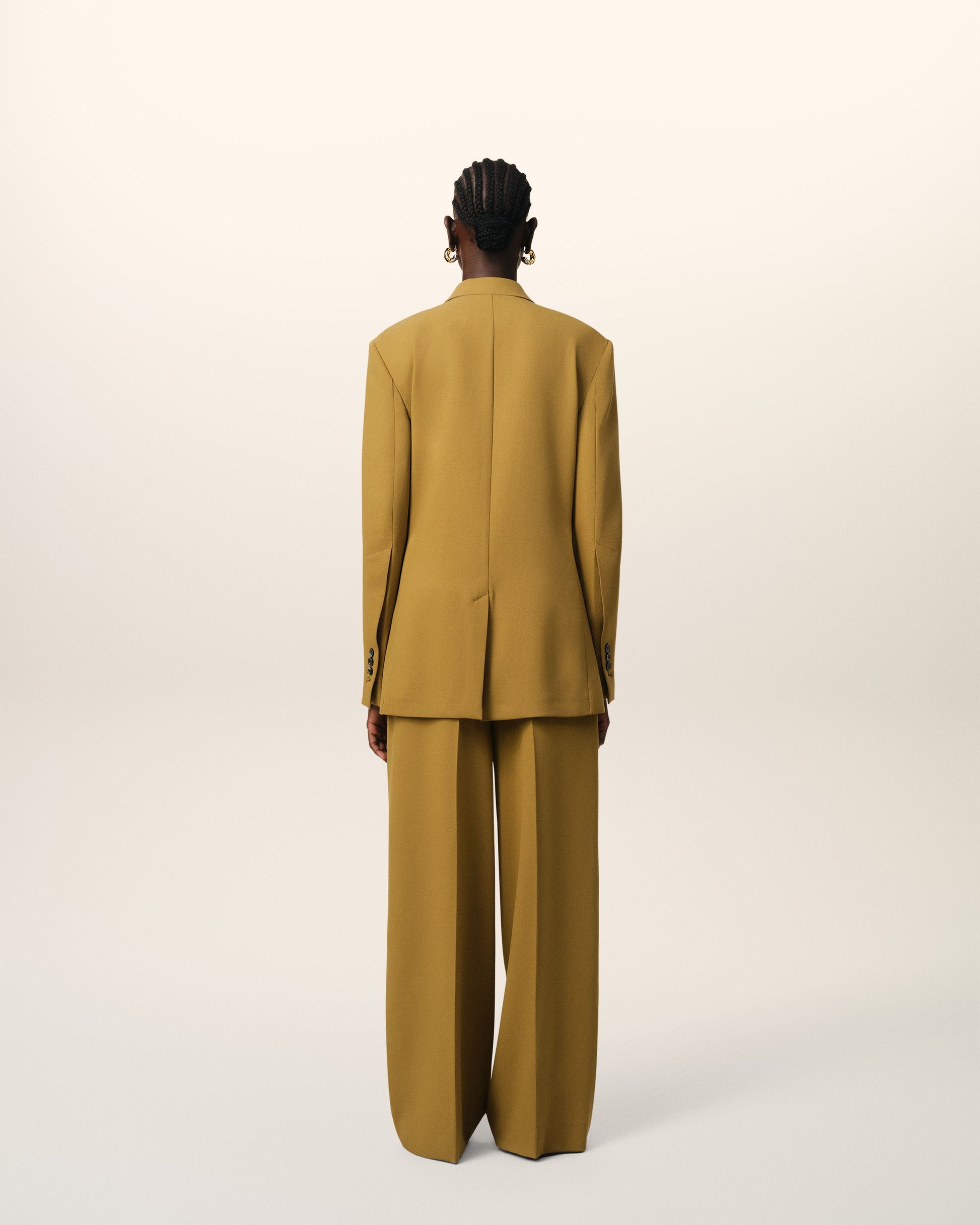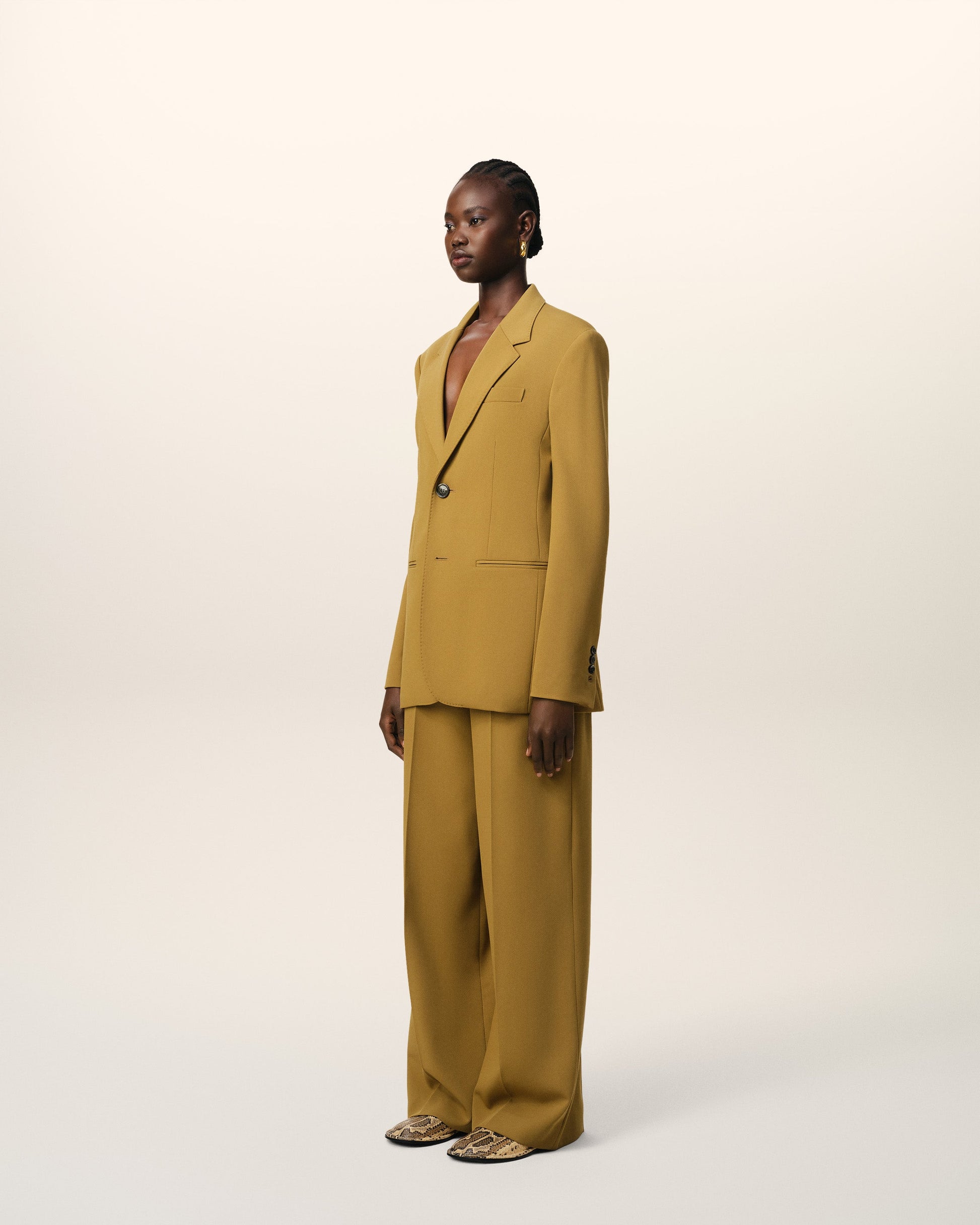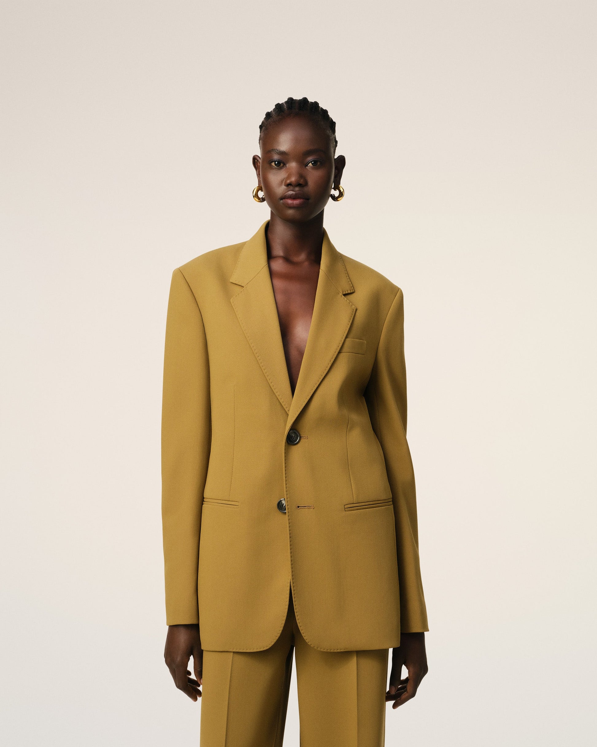 Semi-lined jacket in wool gabardine. Straight fit 75 cm center back length (size 36) Half lined Notch collar Two buttons single breasted Two double piped pockets One chest piped pocket Three inside pockets Buttoned bottom sleeves Centre back slit Horn buttons Made in Romania (with love) REF: FBV011.WV0067.202